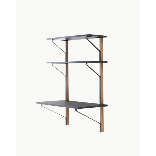 Kaari Wall Shelf with Desk er et stilrent og praktisk møbel designet av de franske designerbrødrene Ronan og Erwan Bouroullec i 2015. Vegghyllen kombinerer solide eikeelementer med bøyde stålbånd, og hyllene har en slitesterk, blank HPL-overflate. Skrivebordet er utført i linoleum, som gir en behagelig og funksjonell arbeidsflate.