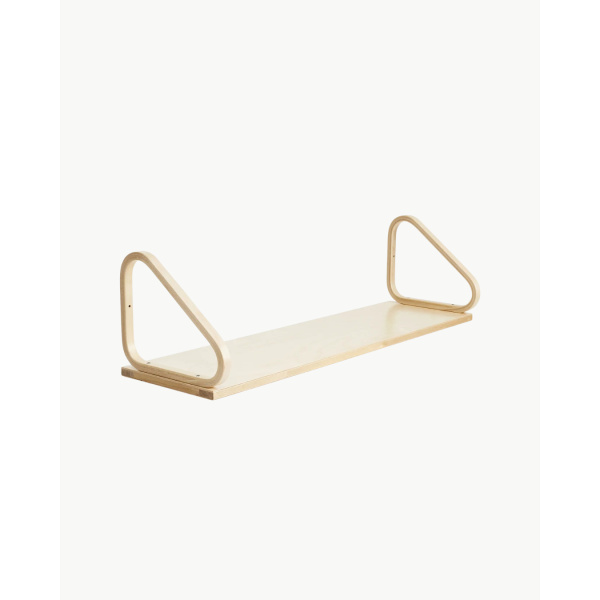 Wall Shelf 112b er en klassiker designet av Alvar Aalto i 1936. Hyllen kombinerer funksjonalitet og estetikk med sitt elegante, praktiske design. Den bruker lamellsløyfer som konsoller for å bære et solid panel i bjørkfinér, og konsollene kan plasseres både under og over panelet – noe som også gjør dem til stilige bokstøtter.