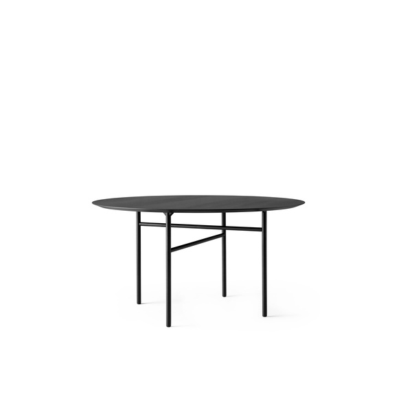 Snaregade Round bord fra Menu, designet av Norm Architects. Dette fantastiske bordet gir et lett og lekent inntrykk. Det har plass til mange middagsgjester og byr inn til lange herlige middager. Topplaten i svart er produsert i lakkert finér og bena i pulverlakkert stål.