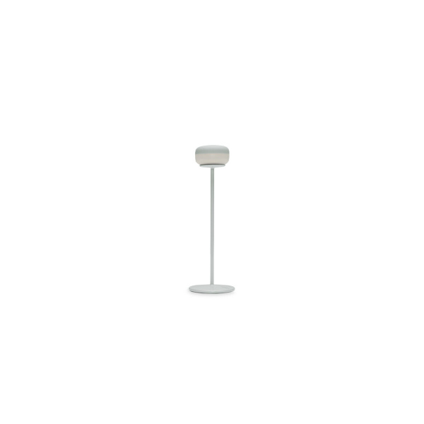 Den lille bordlampen har et relativt minimalistisk design med en rund form og et vakkert samspill mellom slanke og voluminøse former. Lampehodet på toppen omslutter den innebygde LED-lyskilden, slik at lyset skinner indirekte til alle sider i et mykt og jevnt skjær. Lampen er utstyrt med en innebygd dimming som gjør det mulig å justere lysstyrken trinnløst. Ved maksimal lysstyrke kan lampen lyse i opptil 8 timer mellom hver lading. Laderen er inkludert i boksen.