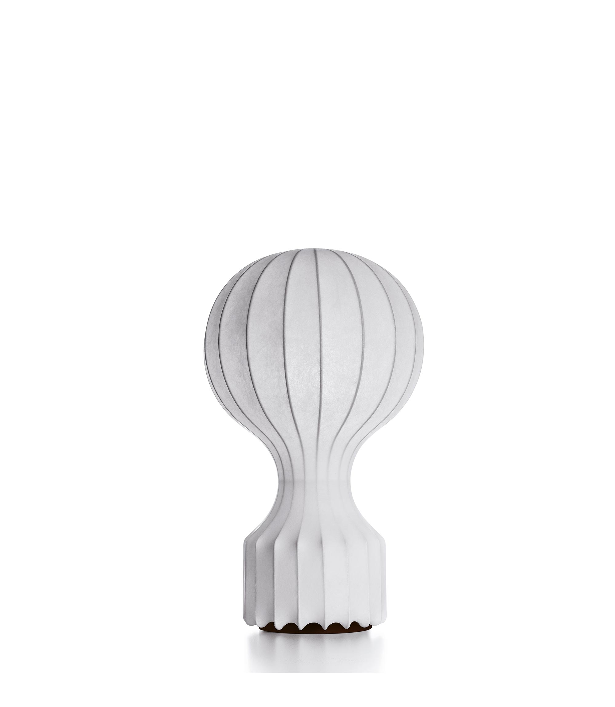 Gatto er designet av Achille og Pier Giacomo Castiglioni, 1960 Produsert i to størrelser, dette ikoniske bordlampe designet av Achille og Pier Giacomo Castiglioni var en av de første proukter hvor de brukte Cocoon materialet. En harpiks som, stenket rundt ståltråd struktur, bestemmer formen på lyset og sprer et varmt lys.