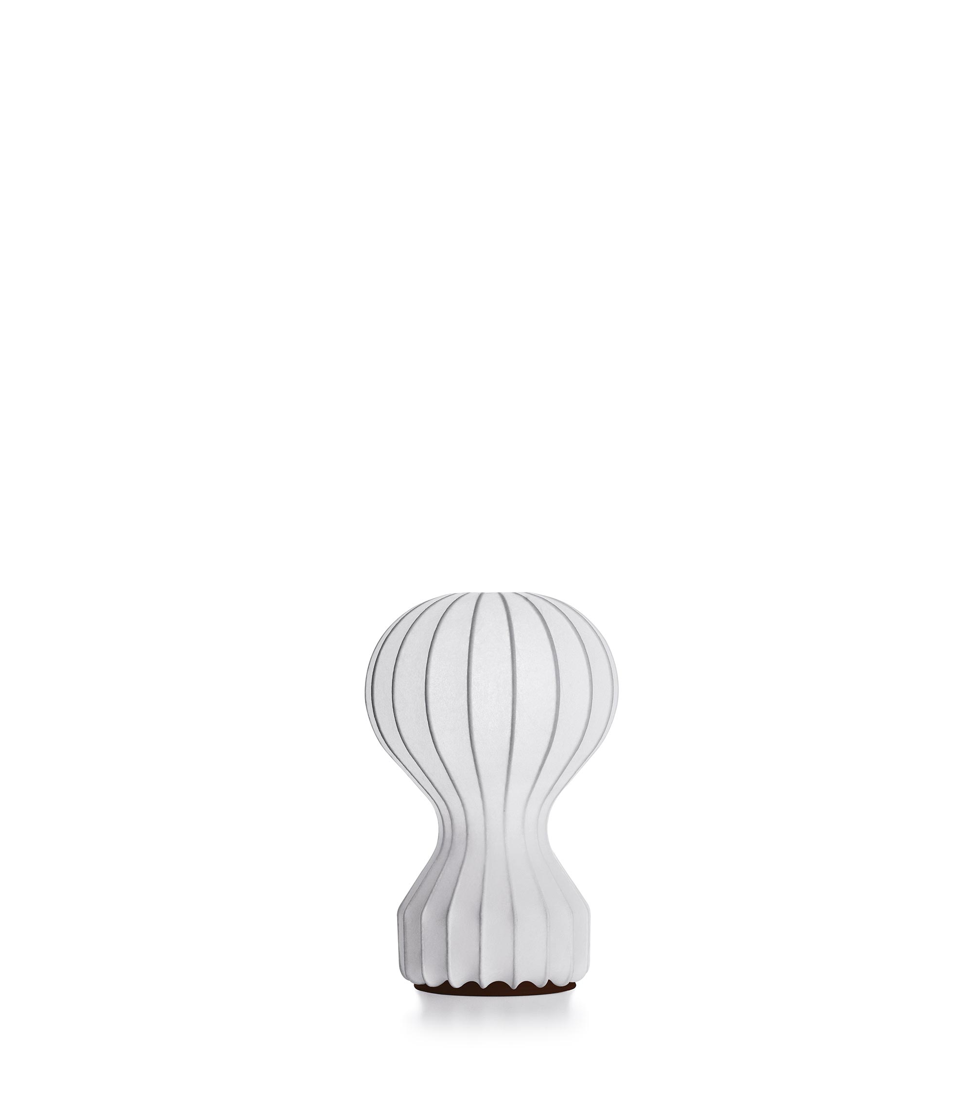 Gatto Piccola er designet av Achille og Pier Giacomo Castiglioni, 1960 Produsert i to størrelser, dette ikoniske bordlampe designet av Achille og Pier Giacomo Castiglioni var en av de første proukter hvor de brukte Cocoon materialet. En harpiks som, stenket rundt ståltråd struktur, bestemmer formen på lyset og sprer et varmt lys.