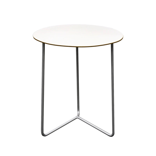 Nisse Strinnings stolklassiker har også et tilhørende mindre rundt bord. Laget av solid stål med et ark av slitesterk kompaktlaminat som tåler alle værforhold. Bordet har avtagbare ben.