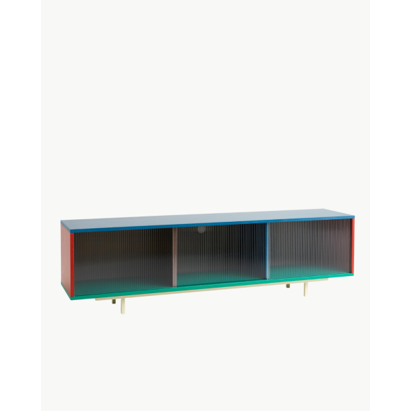 Colour Cabinet Floor er designet av de belgiske designerne Muller Van Severen for HAY, og er en serie lavtstående oppbevaringsmøbler som kombinerer et rent, minimalistisk formspråk med livlige farger. Skroget er laget i organisk innfarget Valchromat®, et unikt og slitesterkt MDF-materiale som er FSC™-sertifisert (FSC-C148805). De elegante skyvedørene i glass og den solide stålrammen gir skapet både holdbarhet og et lett uttrykk.