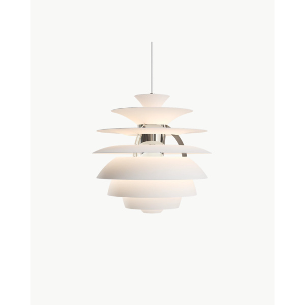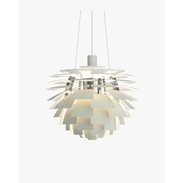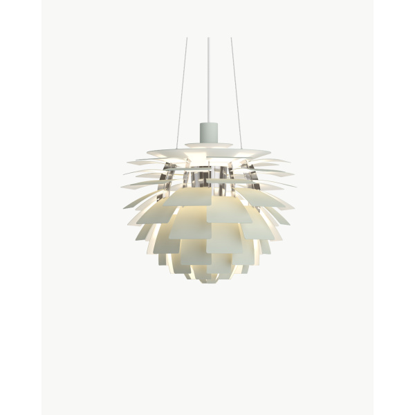 PH Artichoke er en av de mest anerkjente pendellampene i designhistorien, kjent for sitt skulpturelle uttrykk og sitt helt blendefrie lys. Lampen består av 72 presist plasserte metallblader, organisert i 12 rader med seks blader i hver, som sikrer et jevnt og behagelig lys – uansett hvilken vinkel lampen betraktes fra.