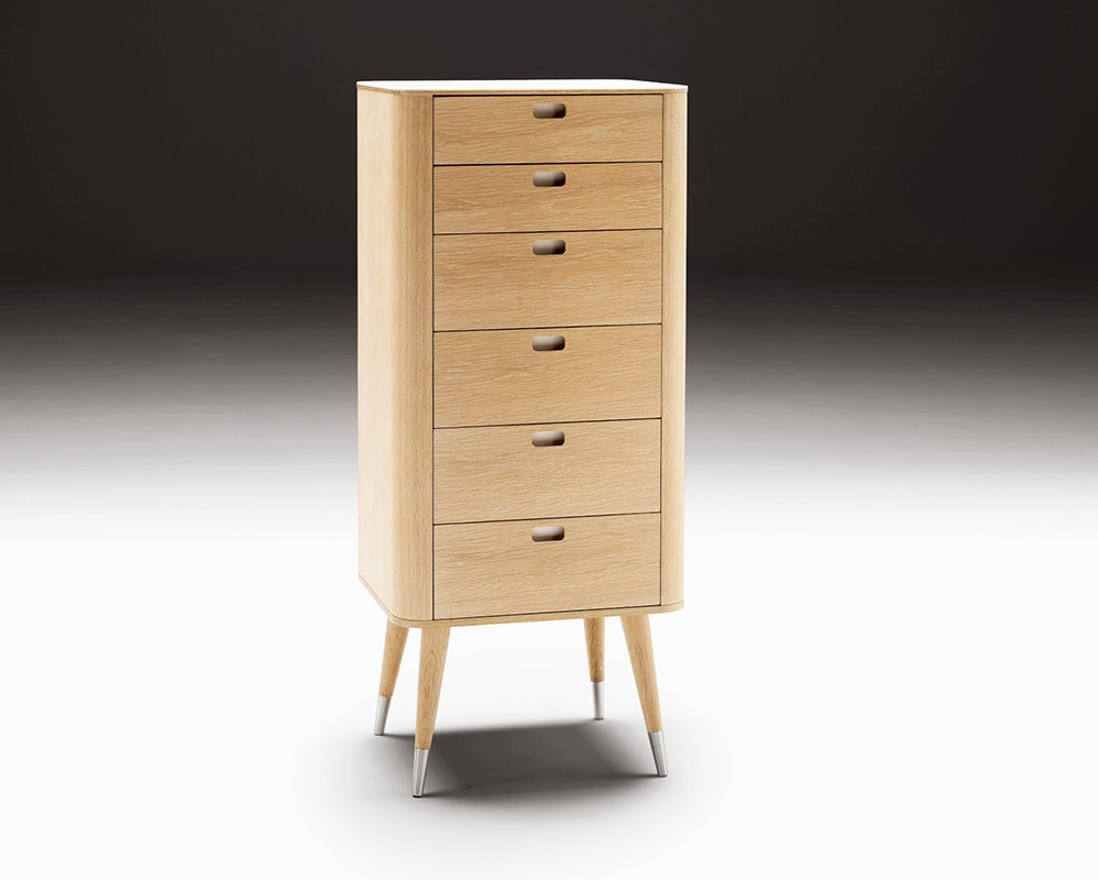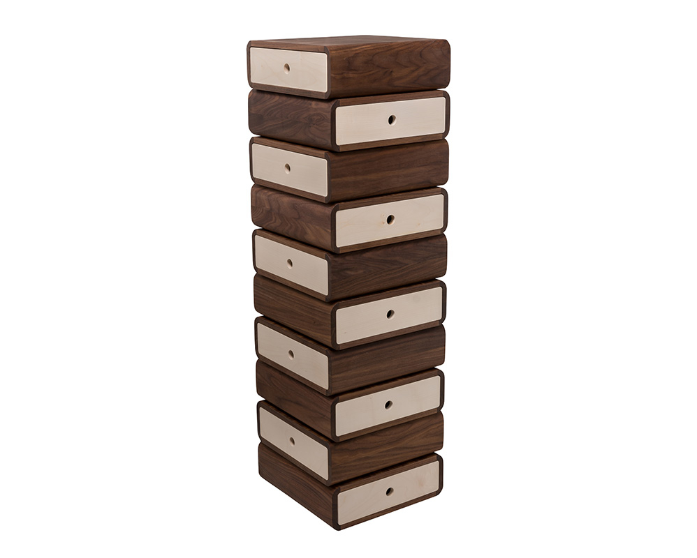 Skuffetårnet Turning Boxes består av 10 bokser med skuffer som hver kan snu 360 grader. Ideen bak designet var å lage et skulpturelt og dekorativt møbel som kan endres for å passe omgivelsene og innbyr til en lekende tilnærming til hjemmet. Det lar deg lage et unikt og funksjonelt møbel som passer nøyaktig til ens individuelle behov. Kombinasjonen av amerikansk, mørk valnøtt og dansk, lys lønn fremhever strukturene vakkert og gir Turning Boxes et eksklusivt uttrykk.