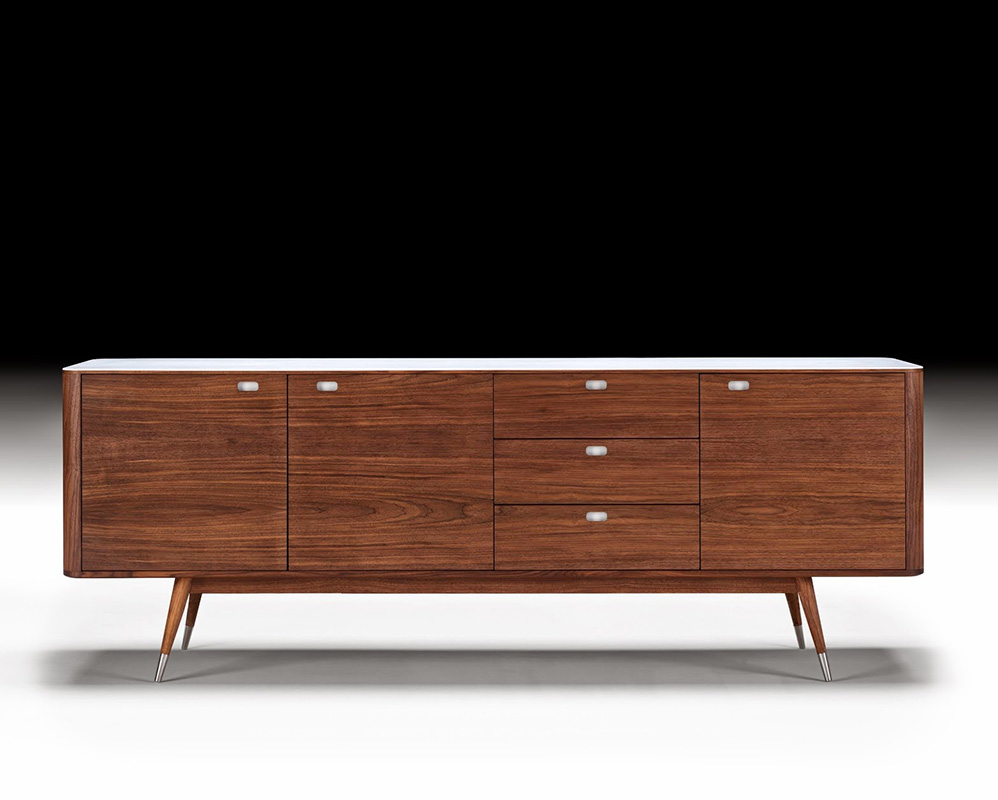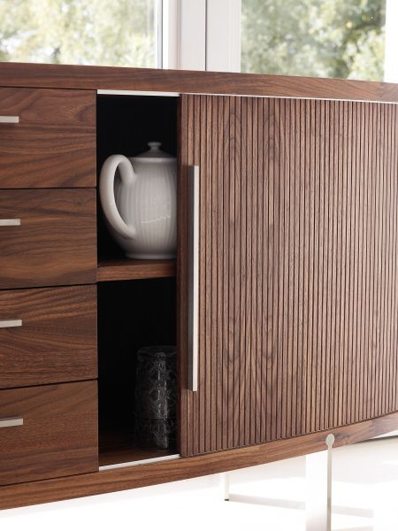 Skapserie fra arkitektduoen Nissen & Gehl, er designet med en raffinert letthet i de beste materialer. En kombinasjon av tre, børstet stål, hvit Corian® og lamelldører gir skapene et karakteristisk formspråk. Innvendig er skapene innredet med 2 massive treskuffer med synlig synking, noe som vitner om det solide håndverket og uttakbare glasshyller, slik at innredningen i skapet kan justeres etter behov. Baren leveres med en innsats i Corian® for vinflasker.