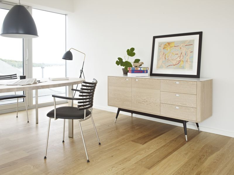 De dekorative bena i børstet stål tilfører møblene letthet og eleganse, og gjør det enkelt å plassere de fleste steder i hjemmet. Skapserien er utformet i en størrelse og med en innredning som byr på et utall bruksområder, enten det er på kjøkken-stue, stue, kontor eller til og med på soverommet.