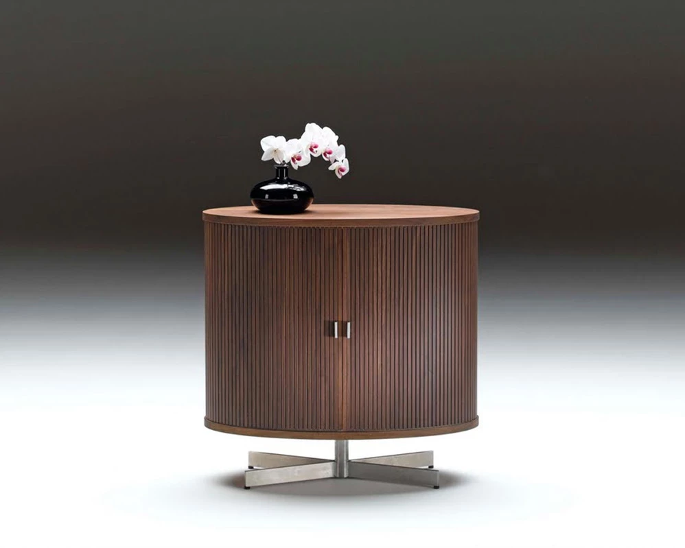 AK 1300 er en oval skjenk med lamelldører og fire skuffer. På hver side av skuffene er det en hylle bak persiennene.
