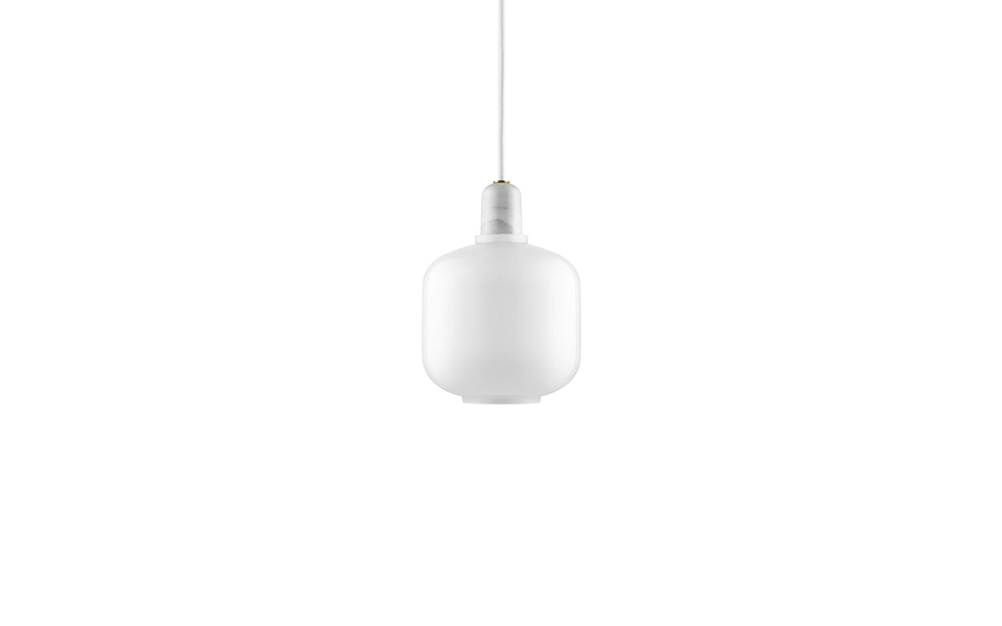 Amp lamp er designet av Simon Legald for Normann Copenhagen. Lampene kjennetegnes ved at materialet glass og marmor gir en kombinasjonen av visuell skjørhet og en sanselig tyngde. Det er brukt materiale av høy kvalitet. Proporsjonene for hver lampe har blitt nøye designet for å sikre den rette balansen mellom hardt og mykt og gjennomsiktig og ugjennomsiktig. Amp lampene kommer med matchende stoffledning på 4 meter. Hvitfarget glass og messing. NB: Inkluderer ikke krok til oppheng.