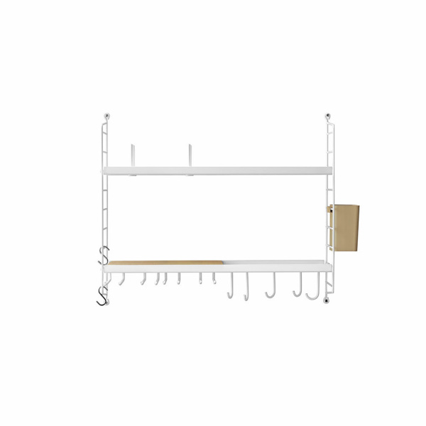 Med et mindre kjøkken i tankene har String Furniture samlet det viktigste i én eske. Følgende produkter er inkludert: To gavler H50 x D20 cm i hvitt, to metallhyller med lav kant B58 x D30 cm i hvitt, ett tallerkenstativ D20 cm i hvitt, to glasshengere D20 cm i hvitt, ett underlag B19,3 x D29,6 x H1,85 cm i kork, én organizer-boks B9 x D7 x H12 cm i beige, fem kroker i hvitt samt to s-kroker i rustfritt stål.
