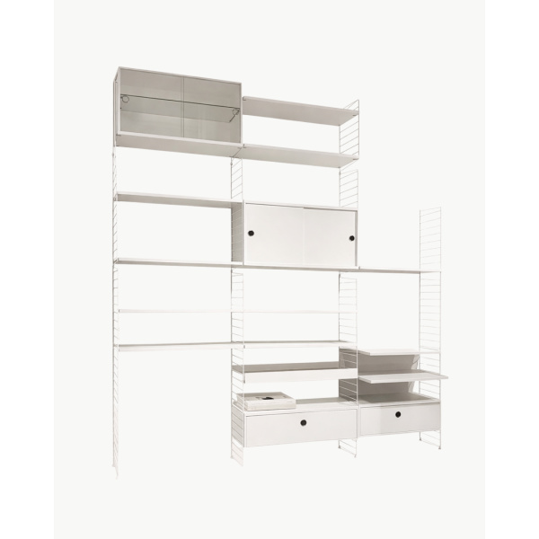 Dette String-oppsettet er en klassisk og fleksibel oppbevaringsløsning med et tidløst skandinavisk uttrykk. String System er kjent for sitt modulbaserte design som gjør det enkelt å tilpasse etter behov – enten det brukes i stue, kontor, kjøkken eller gang. Med sitt lette uttrykk og gjennomtenkte konstruksjon kombinerer systemet funksjonalitet og estetikk på en elegant måte.