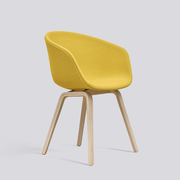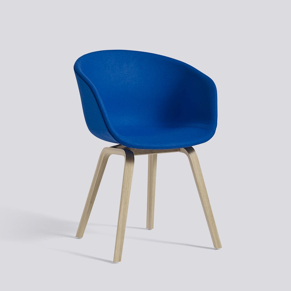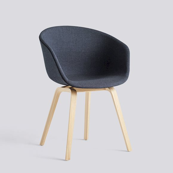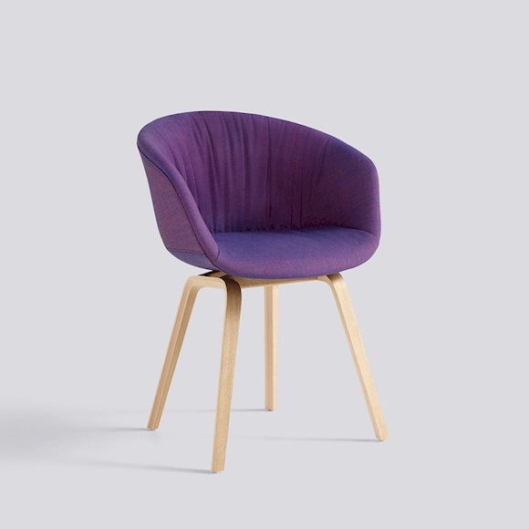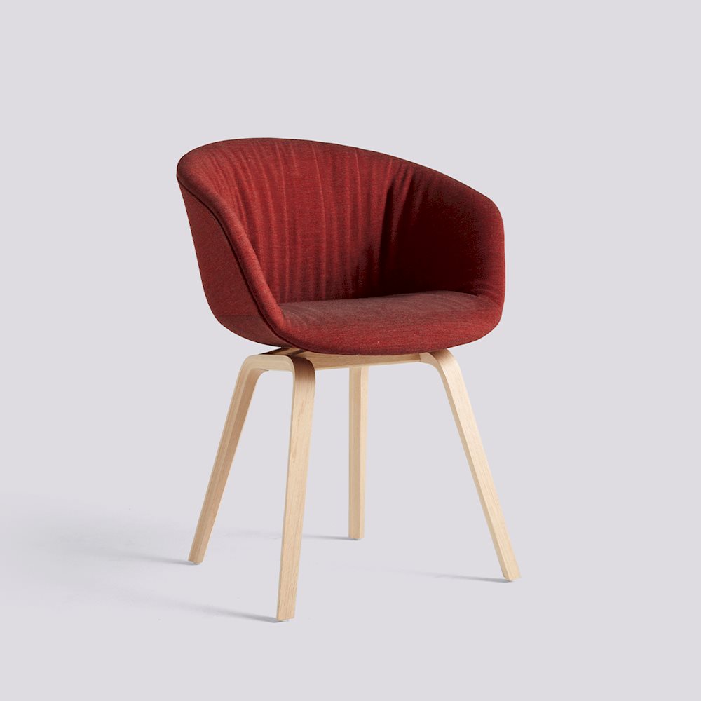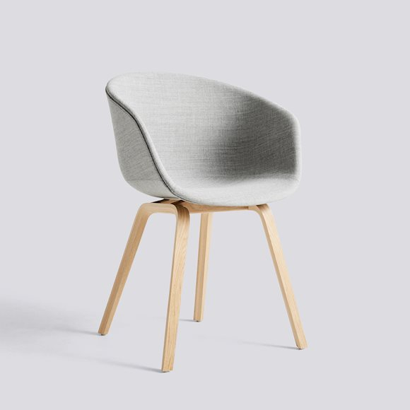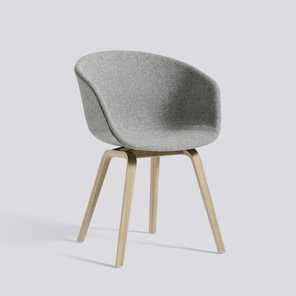 About a Chair 23 fra Hay. Tanken med serien About a Chair var å skape en stol med veldig enkel design og kombinere form, funksjon, detalj og estetikk. Stolene fra serien About a Chair fungerer like bra i konferanserommet som rundt matsalbordet. Stolen er produsert i polypropen og har et vakkert trekk i stoff. Stolen har dessuten dekorative eike ben.