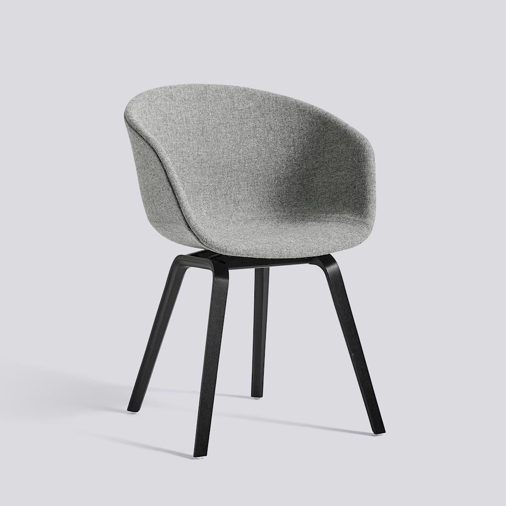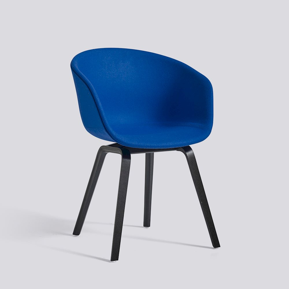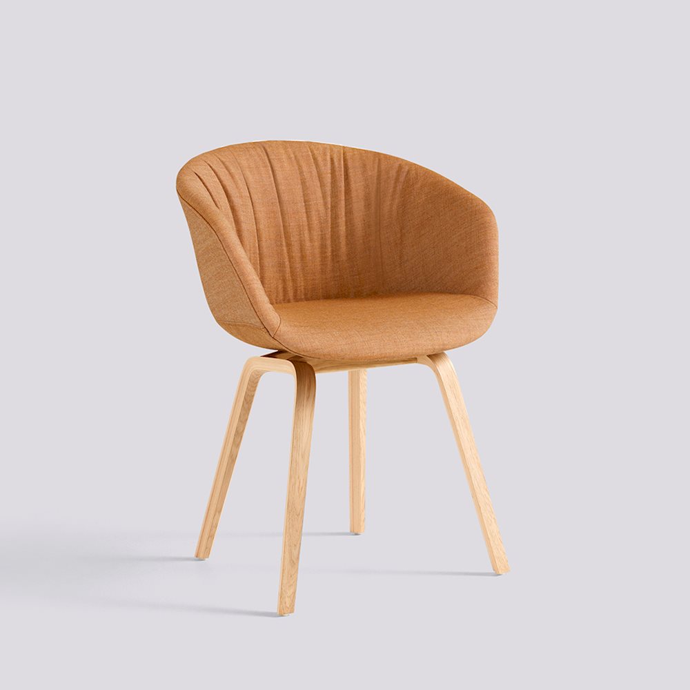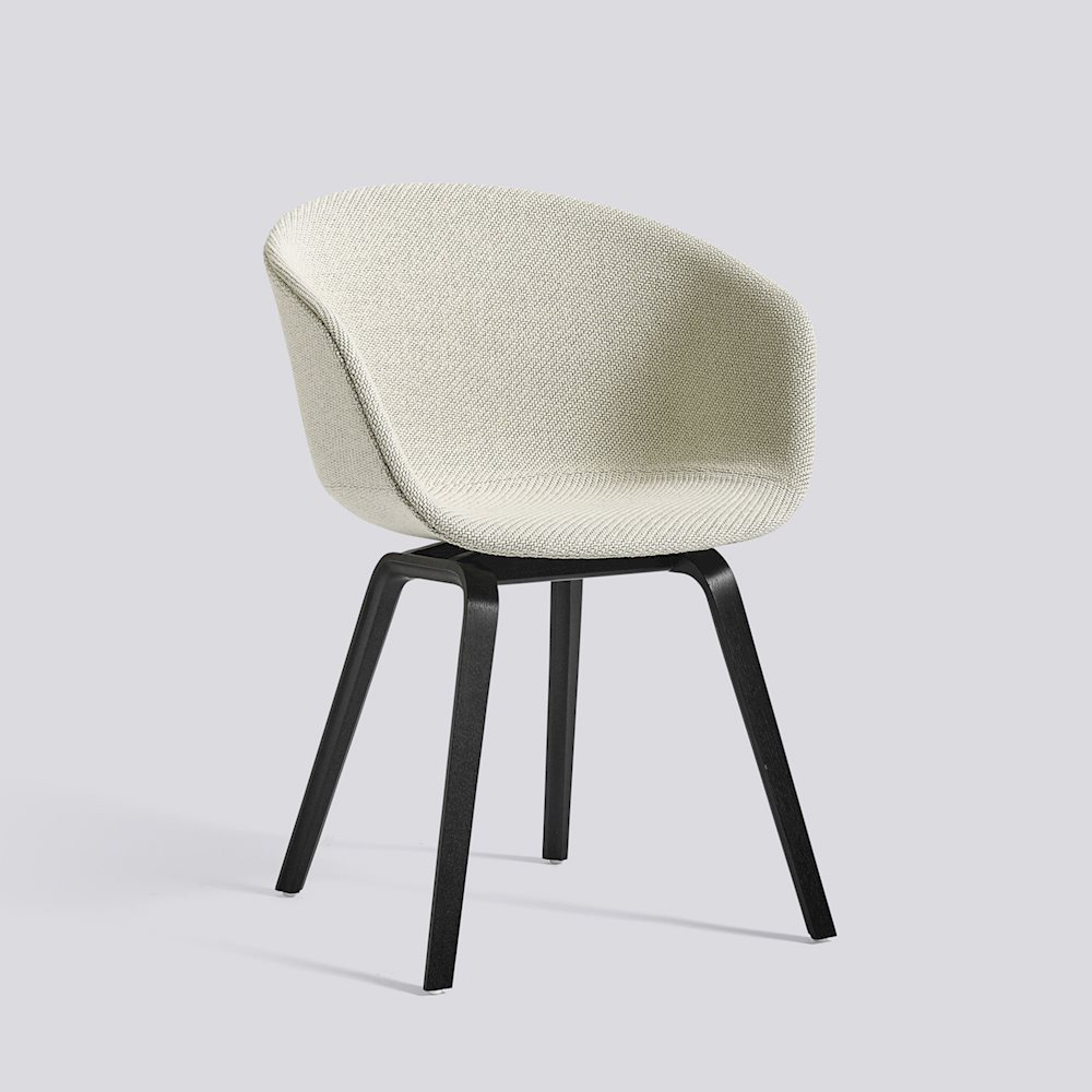 About a Chair 23 fra Hay. Tanken med serien About a Chair var å skape en stol med veldig enkel design og kombinere form, funksjon, detalj og estetikk. Stolene fra serien About a Chair fungerer like bra i konferanserommet som rundt matsalbordet. Stolen er produsert i polypropen og har et vakkert trekk i stoff. Stolen har dessuten dekorative eike ben.