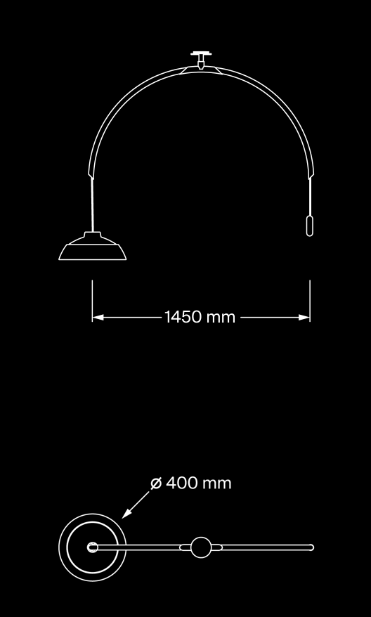 Det intime lyset som tilbys av Model 2129, bryter inn plassen i en varm atmosfære. Armaturen har en diskret motvekt og en stor buetformet arm i gjennomsiktig metakrylat som er festet til taket og i stand til å rotere 360 grader horisontalt. Den koppformede reflektor er laget av to dreide aluminiumstykker malt hvit og kaviar grå. Både dowel for takmontering og motvekt er laget av malt messing.