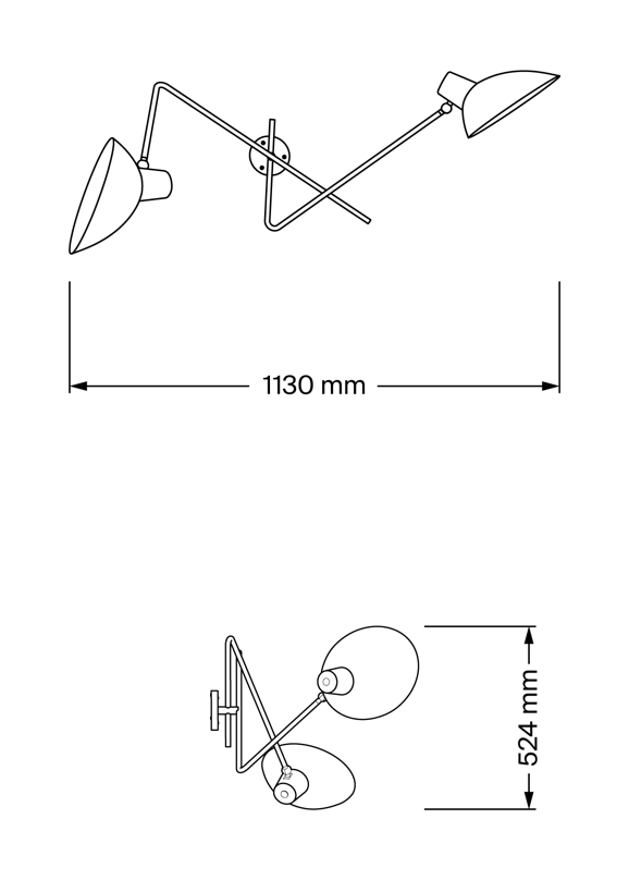 Twin-modellen er et elegant toarmet vegglys. Montert på en messingbrakett strekker de to messingarmene ut i motsatt retning. De brede signaturreflektorene kan vinkles og roteres for å gi både indirekte og direkte belysning samtidig. En skulpturell vegglampe med flere belysningssammensetninger.