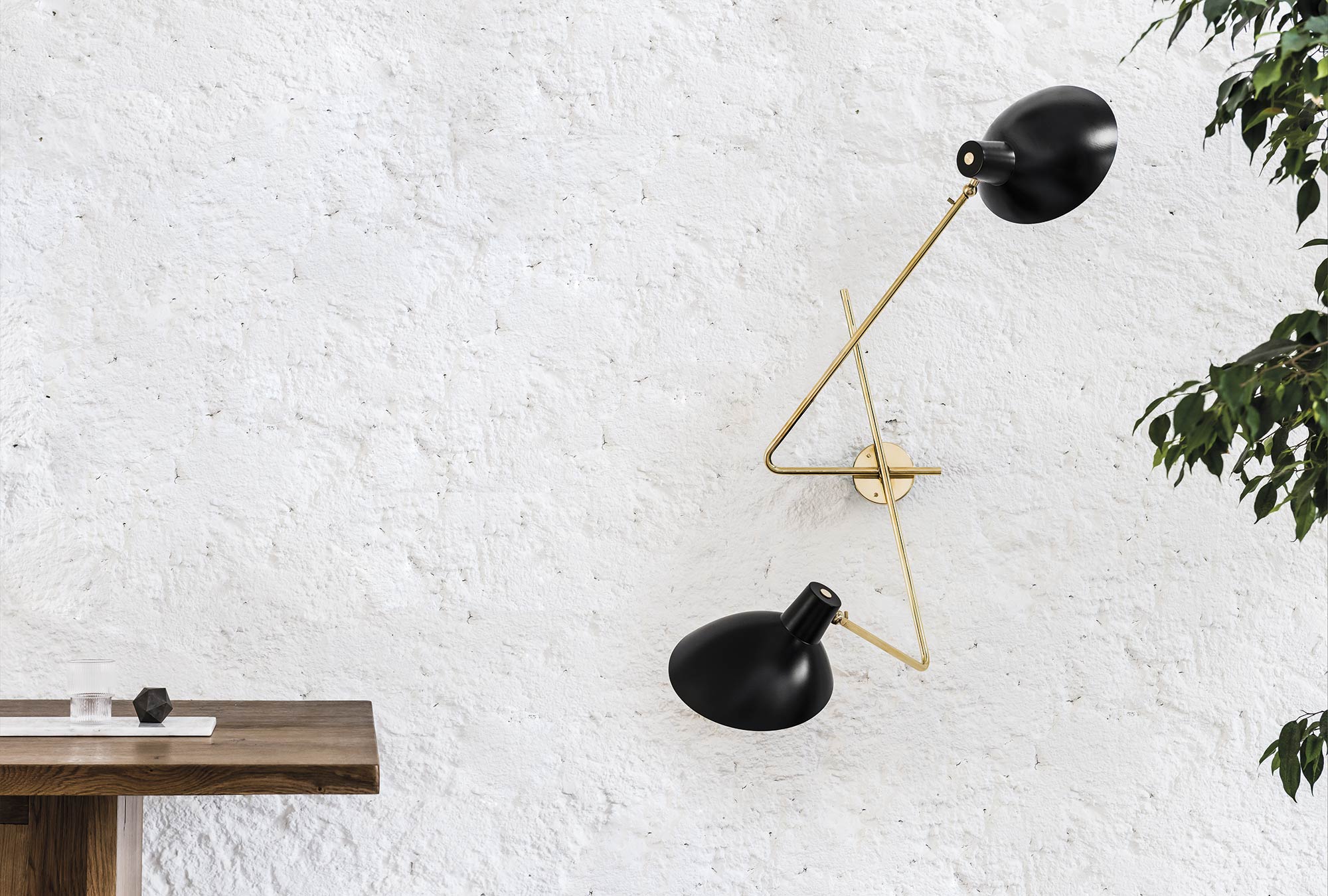 Twin-modellen er et elegant toarmet vegglys. Montert på en messingbrakett strekker de to messingarmene ut i motsatt retning. De brede signaturreflektorene kan vinkles og roteres for å gi både indirekte og direkte belysning samtidig. En skulpturell vegglampe med flere belysningssammensetninger.