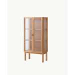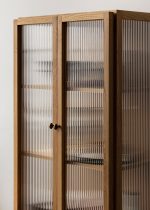 De elegante riflede glassdørene gir et sofistikert uttrykk og lar innholdet skimtes diskret gjennom glasset, noe som gjør skapet ideelt for oppbevaring av bøker, dekorative objekter eller personlige samlinger. Bak dørene finner du to høydejusterbare hyller i eikefinér, som gir fleksibel oppbevaring tilpasset dine behov.