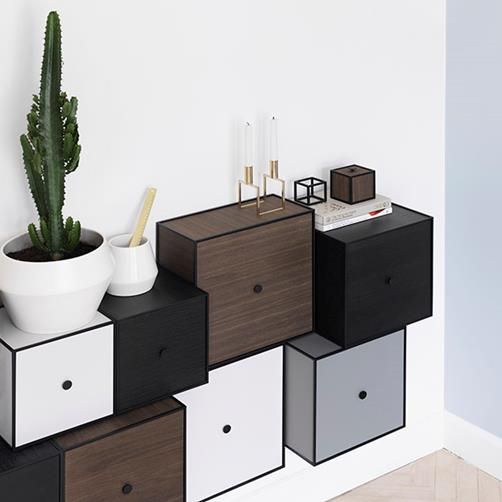 Frame er en serie kvadratiske bokser i rammer fra by Lassen. Denne fleksible oppbevaringsløsningen kan henges på veggen med de medfølgende brakettene, eller stå direkte på gulvet. De individuelle kombinasjonsmulighetene er uendelige.