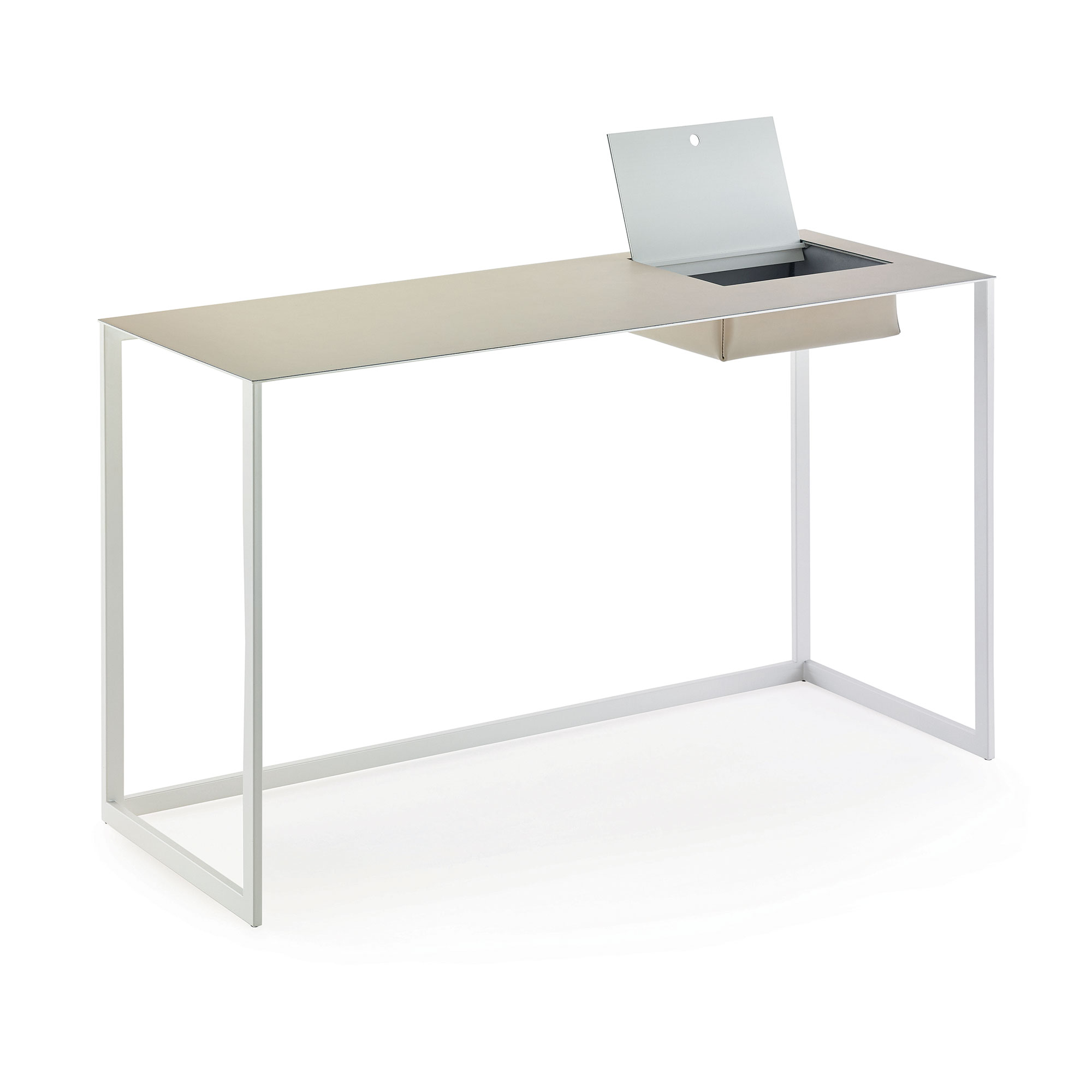 Tilgjengelig i følgende størrelser: L 120 x H 71,5 – 118,5 x D 78 cm L 160 x H 71,5 – 118,5 x D 78 cm L 140 x H 71,5 – 118,5 x D 78 cm L 180 x H 71,5 – 118,5 x D 90 cm Skrivebordsplaten kommer i finert eik eller ask med klarlakk (glans 5), samt hvit laminat eller grå linoleum.