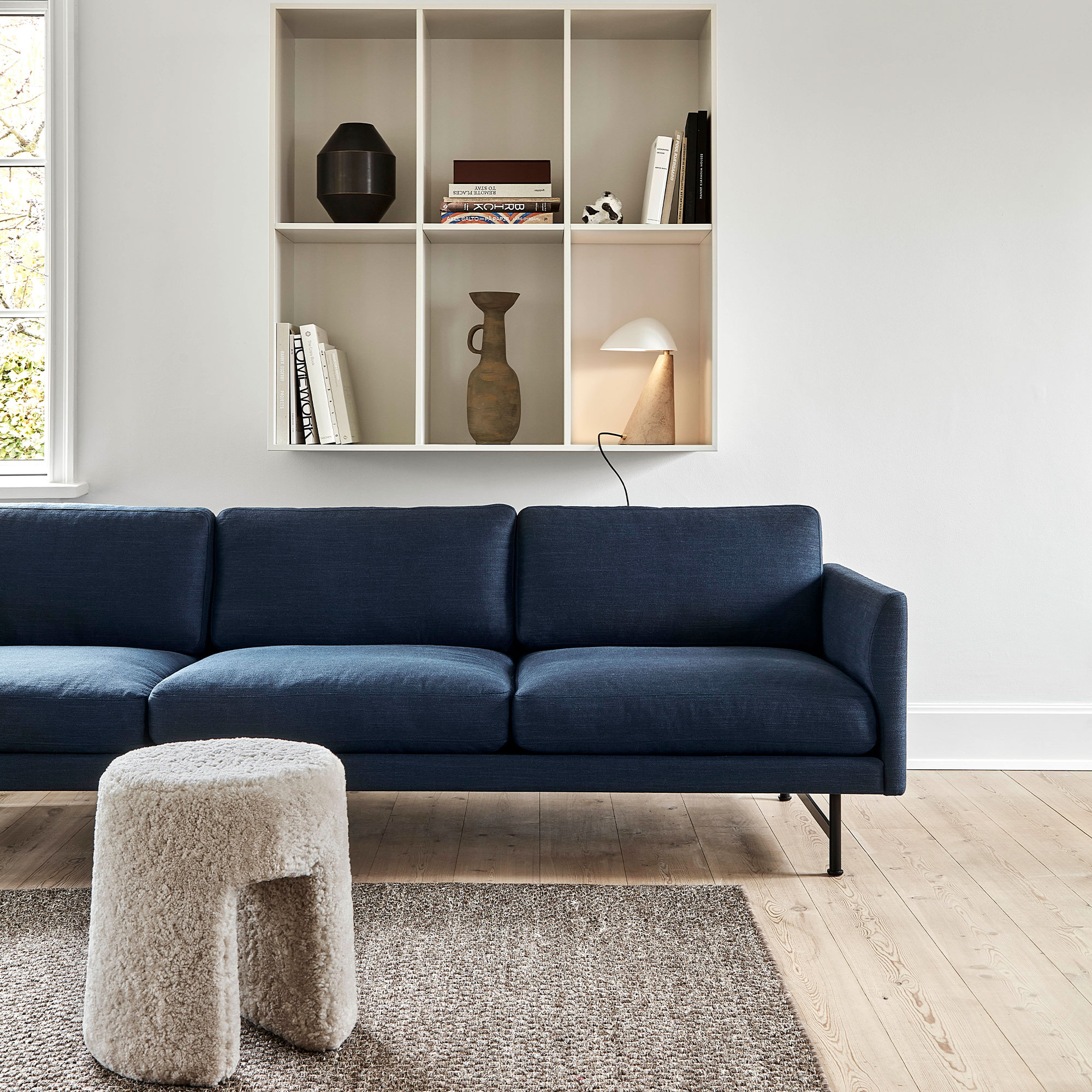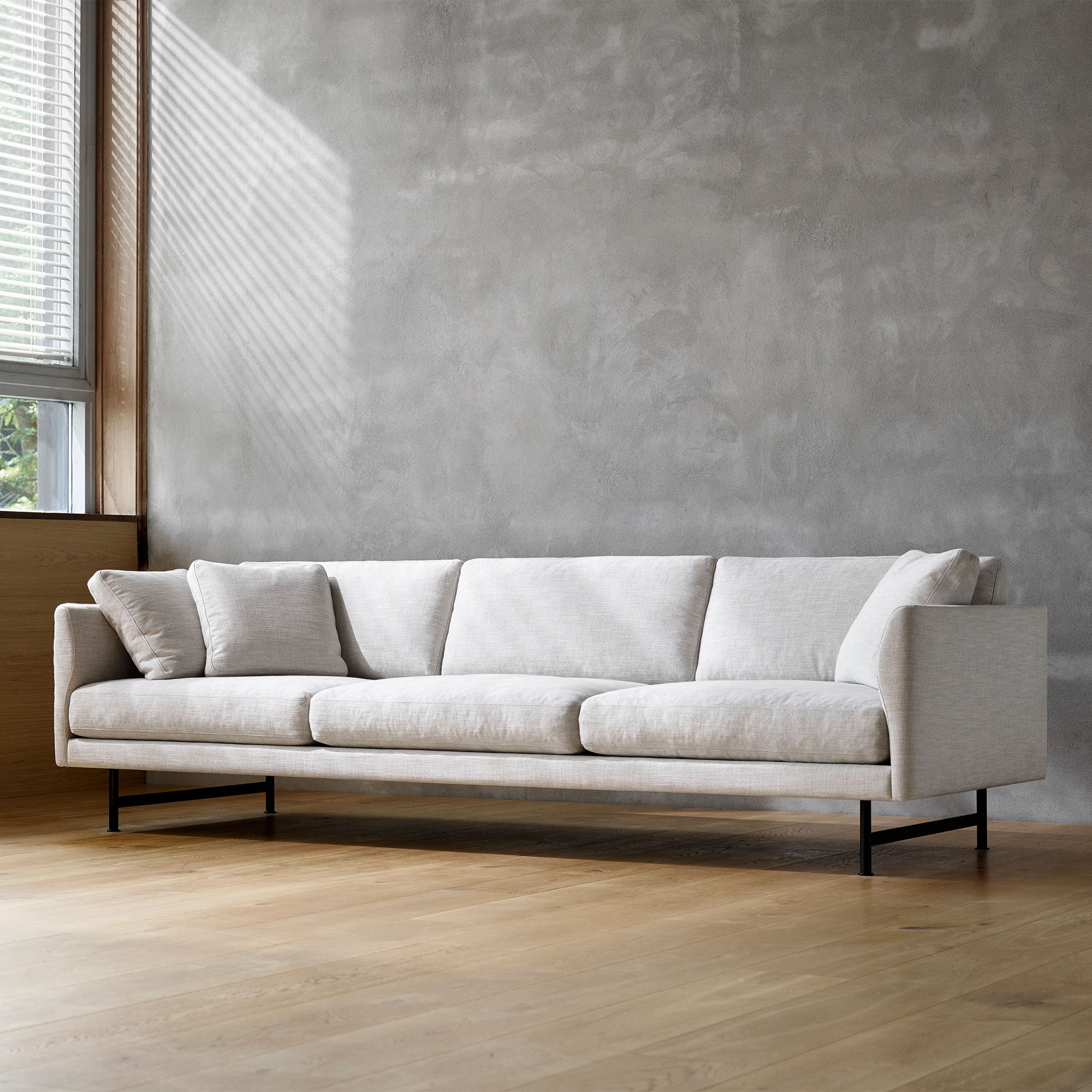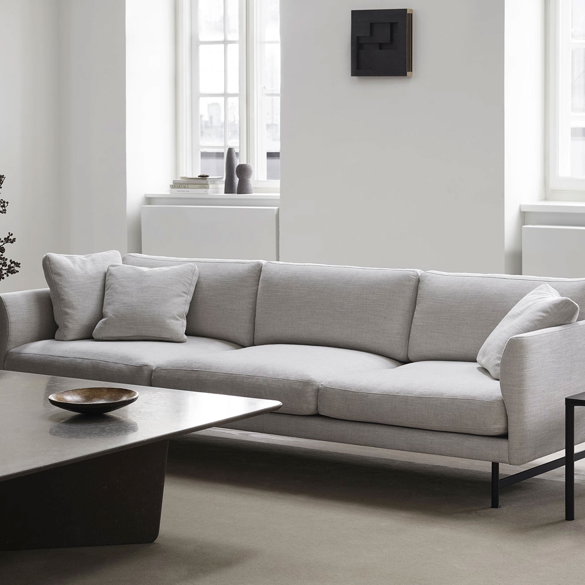 Calmo 3 Seater 80 er en stilren sofa designet i 2019 av den portugisiske designeren Hugo Passos for Fredericia Furniture. Den romslige 3-seterssofaen har et design som karakteriseres av de rette linjene og mykt formede detaljer. Formene i kombinasjon med store, myke putene gjør sofaen like bekvem som elegant. Denne versjon av Calmo 3 Seater 80 har stoff Sunniva og leveres med en base i lakkert eik, røkt eik eller metall i matt kromfarge.
