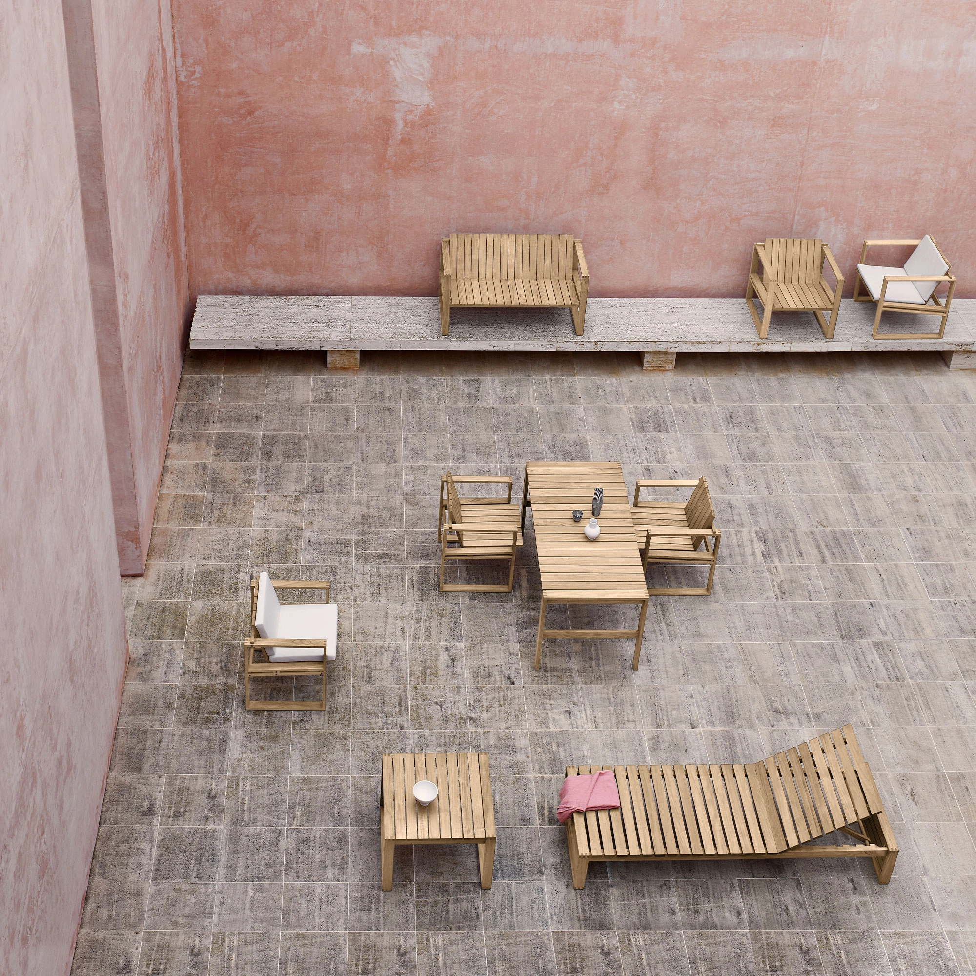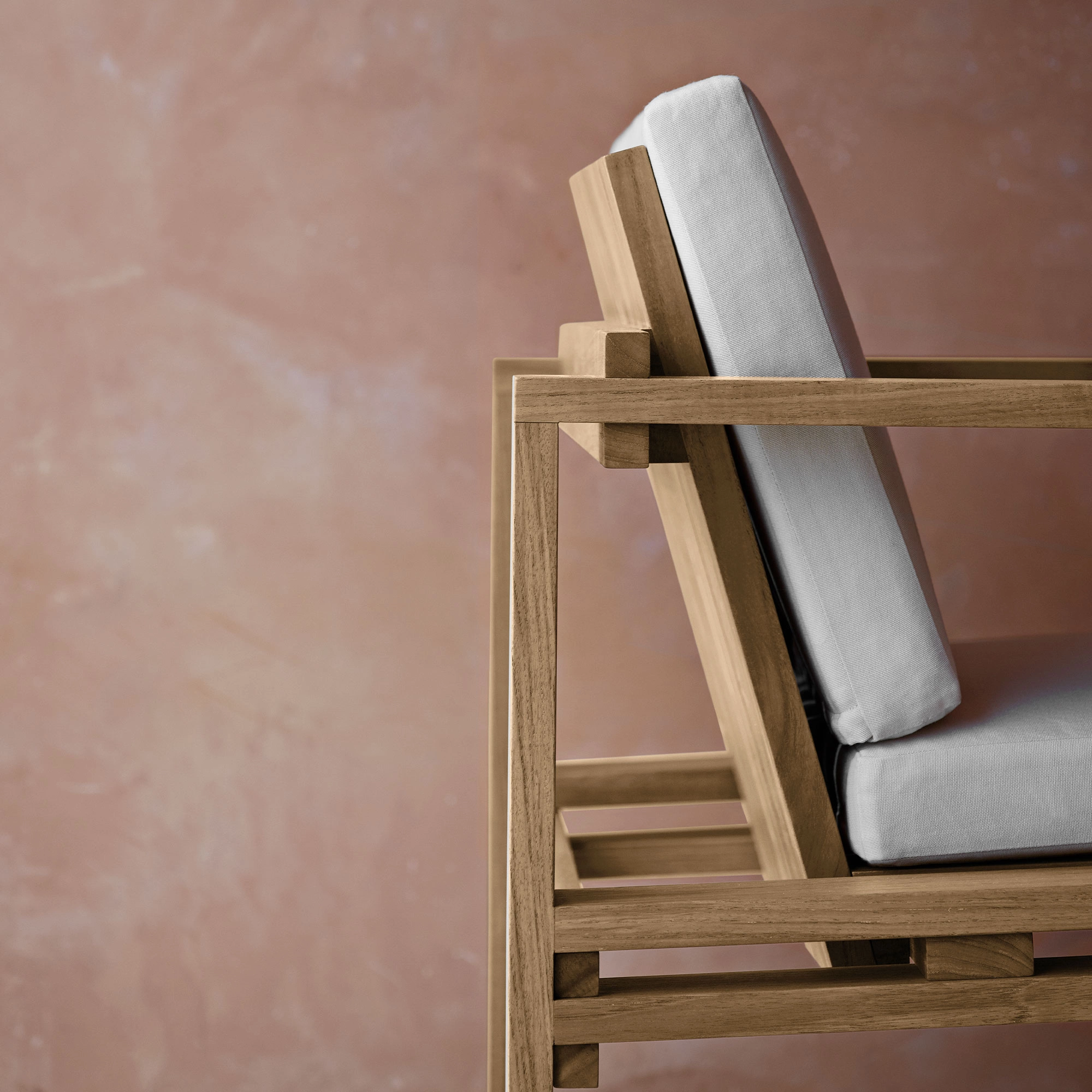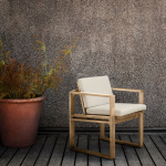 I tillegg til spisestolen består Kjær Indoor-Outdoor-serien av en lenestol, et sidebord, et spisebord, en to-seter salong, en svingsofa og en solseng. Alle seter, stoler og senger kan leveres med slanke, støttende puter laget av værbestandig Sunbrella-stoff.