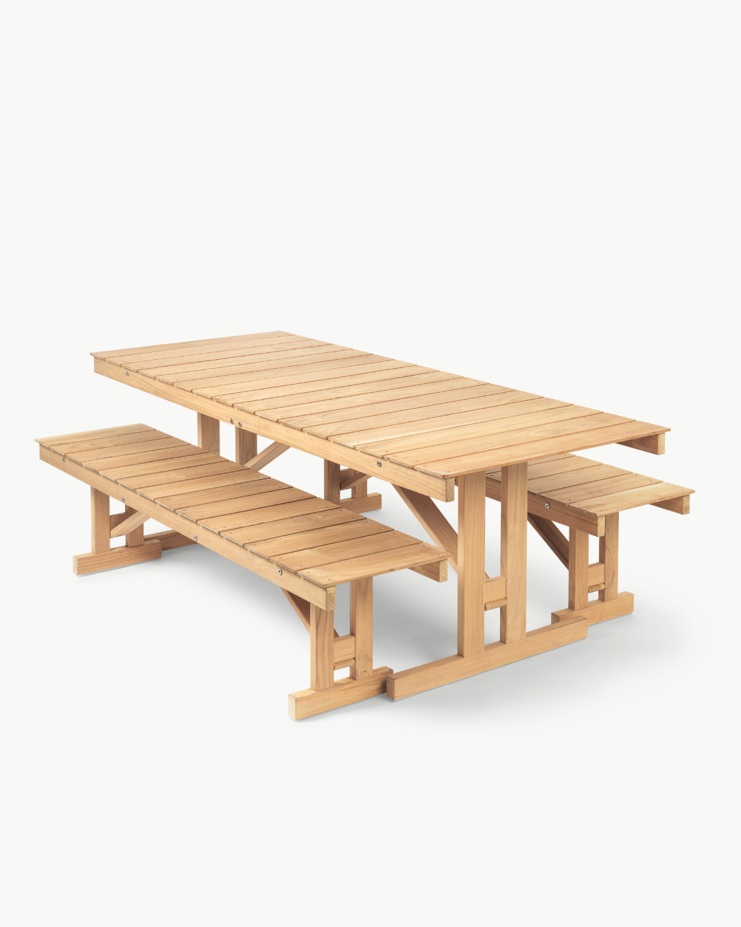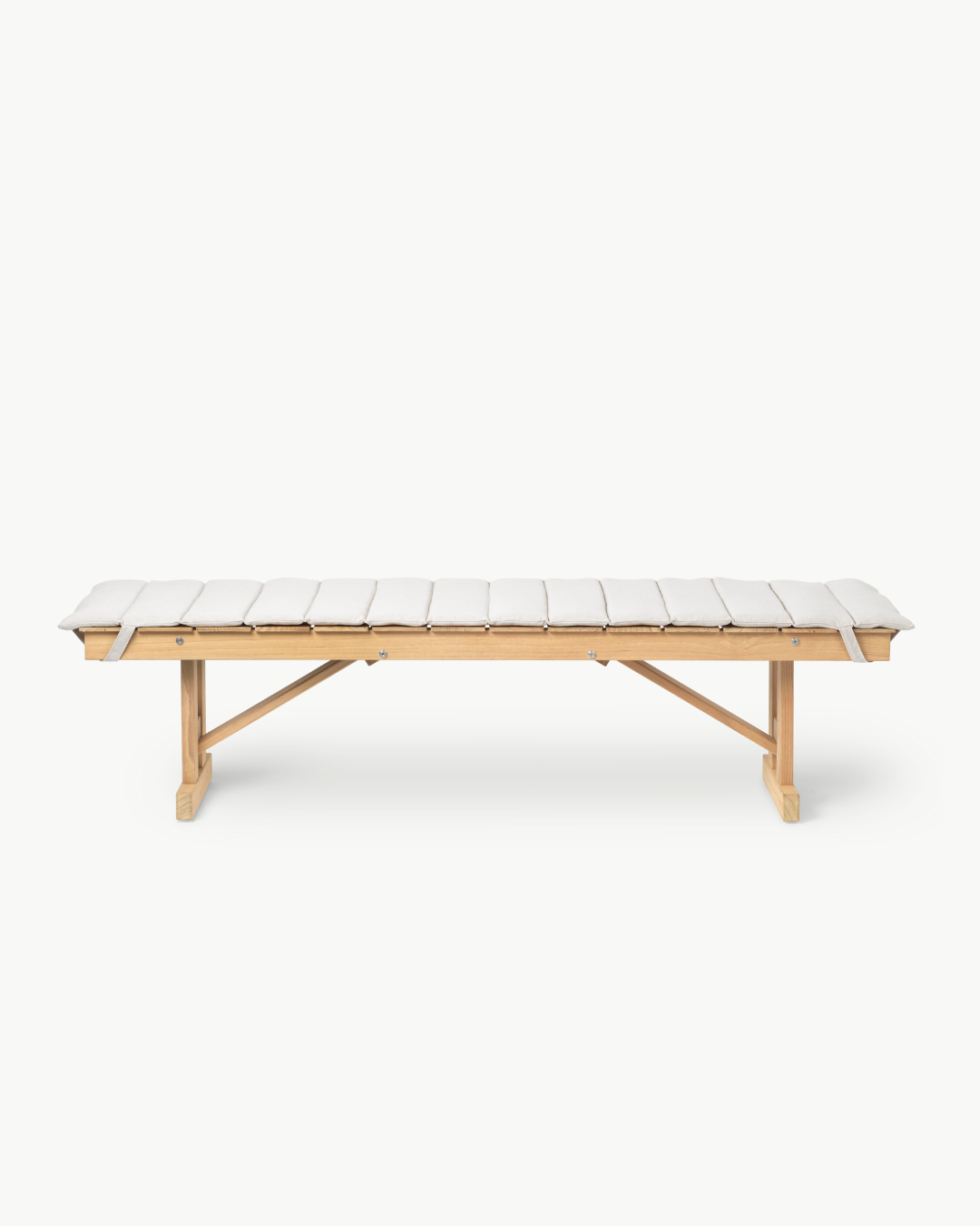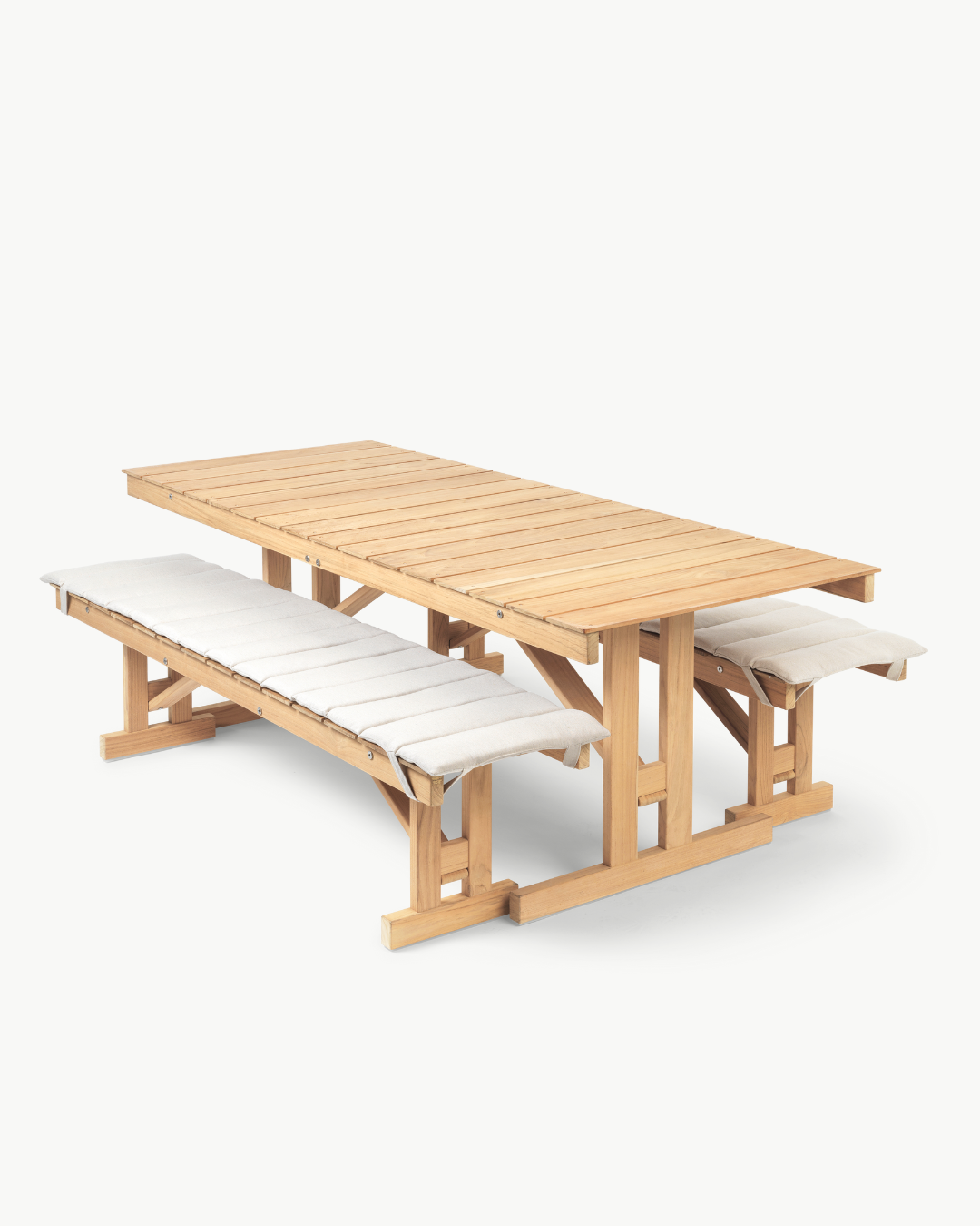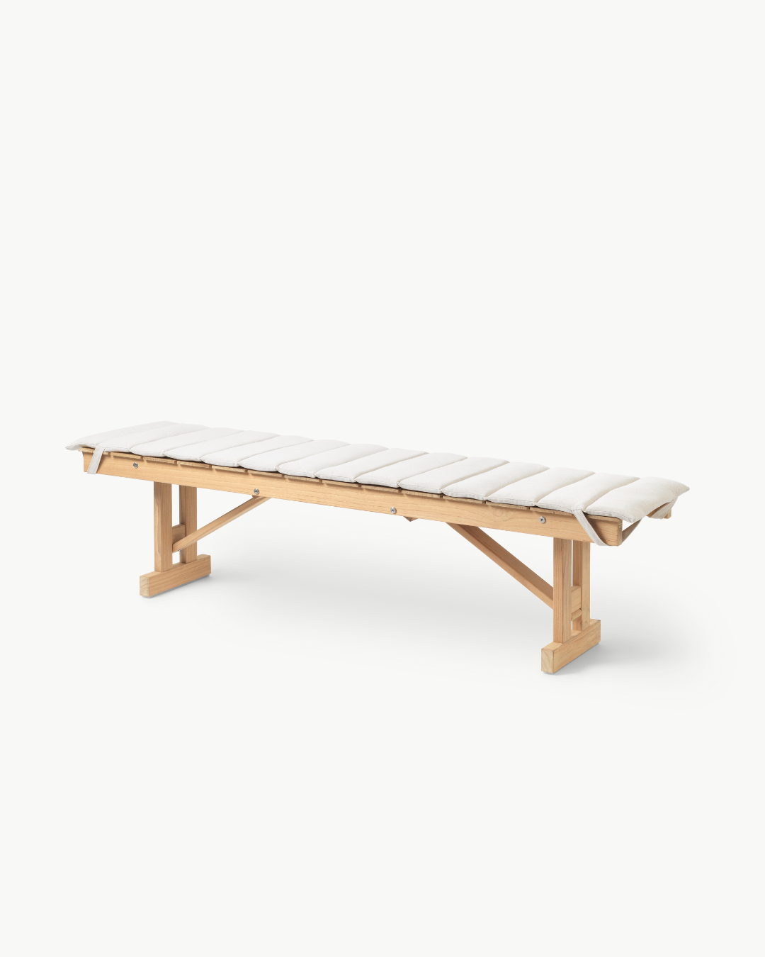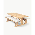 Carl Hansen & Søn gjenintroduserer det klassiske designet, ekspert utformet i ubehandlet og slitesterk FSC®-sertifisert teak. Benken fra serien har robuste ben som enkelt kan foldes under det elegante setet i trelister og oppbevares hengende når den ikke er i bruk. Komfortable puter laget av værbestandig Sunbrella-stoff gjør benken enda mer komfortabel.