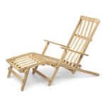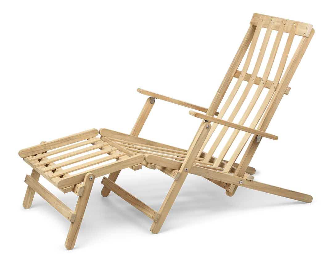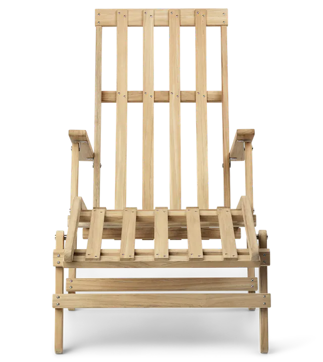 Stolen er laget av solid, ubehandlet teak – et slitesterkt og værbestandig treslag som utvikler en vakker patina over tid. Den tilbakelente rammen og formede trespilene følger kroppens naturlige linjer, og gir en optimal sitteopplevelse med en lett og sofistikert fremtoning. Den medfølgende fotskammelen forsterker komforten ytterligere og inviterer til full avslapning i hagen, på terrassen eller ved sommerhytta.