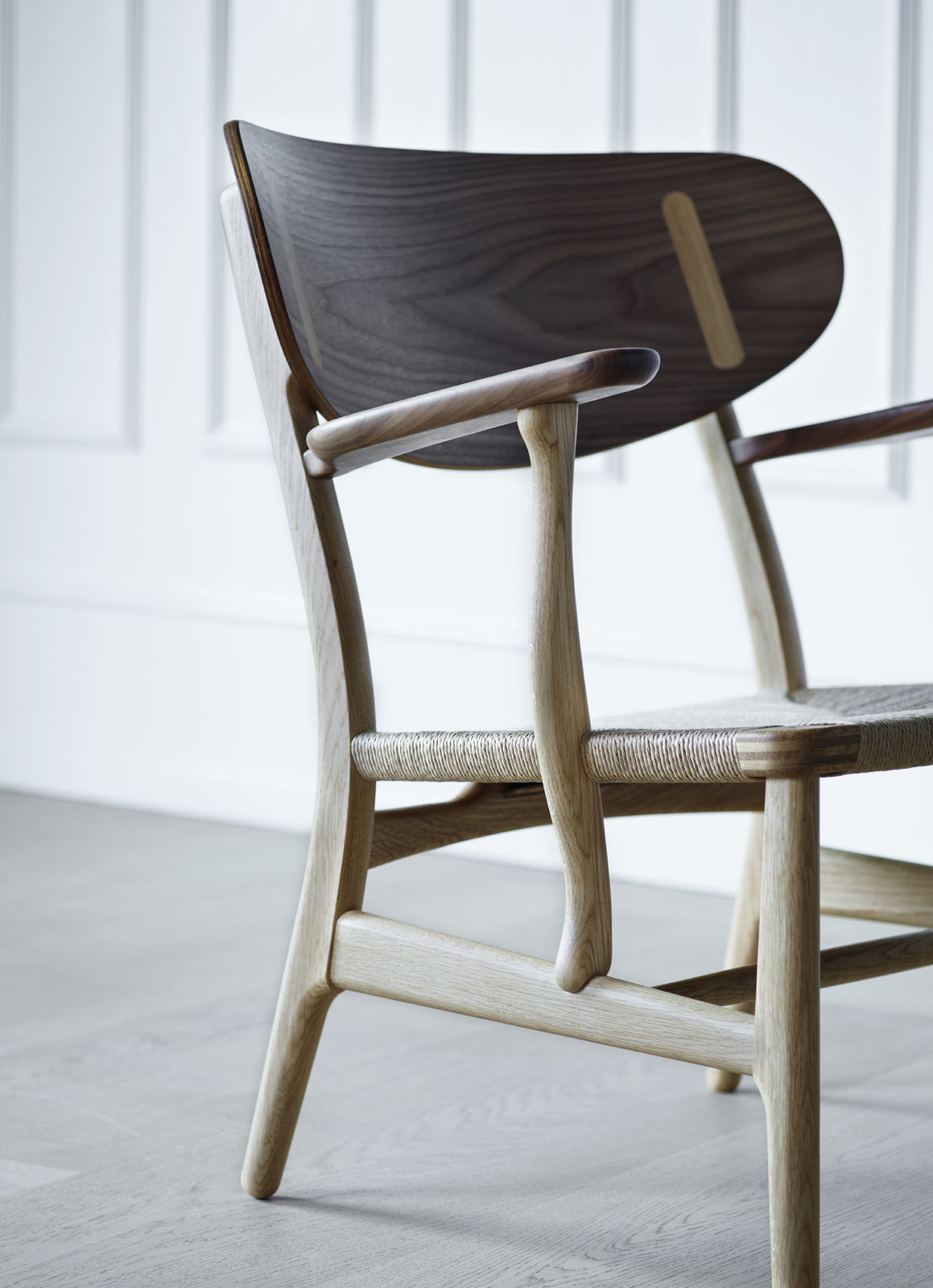 CH22-lenestolen til Hans J. Wegner ble satt inn i produksjon av Carl Hansen & Søn i 2016. Den har elegante armlener, et konvolutt-vevet papirstøysete og et karakteristisk bakskjell i formpresset finer med slående avlange dekselhett . Stolens raffinerte snekker er tydelig i seterammen med fingersammenheng, med forbenene som låser seg inn i trekile i en farge som er i kontrast til rammen.