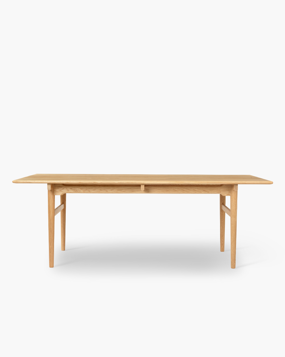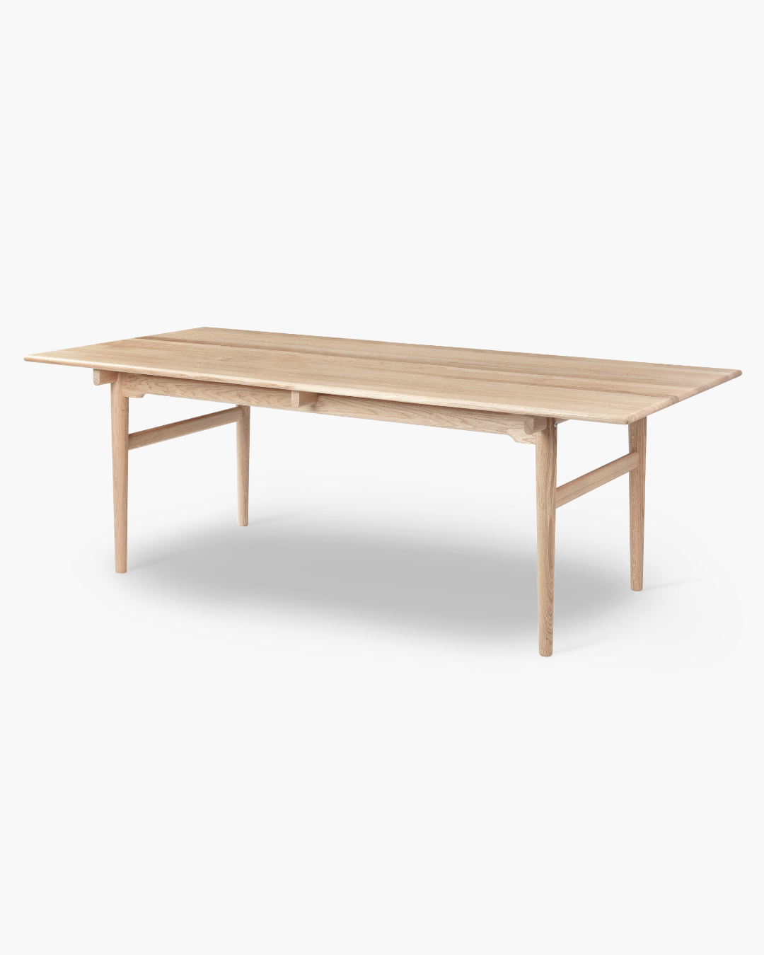 Bordet er laget i massivt tre og kjennetegnes av sin lette, visuelle form kombinert med en solid og slitesterk konstruksjon. De avrundede kantene og det gjennomtenkte understellet gir bordet et lett uttrykk, samtidig som det står støtt i både hverdagsbruk og til fest.