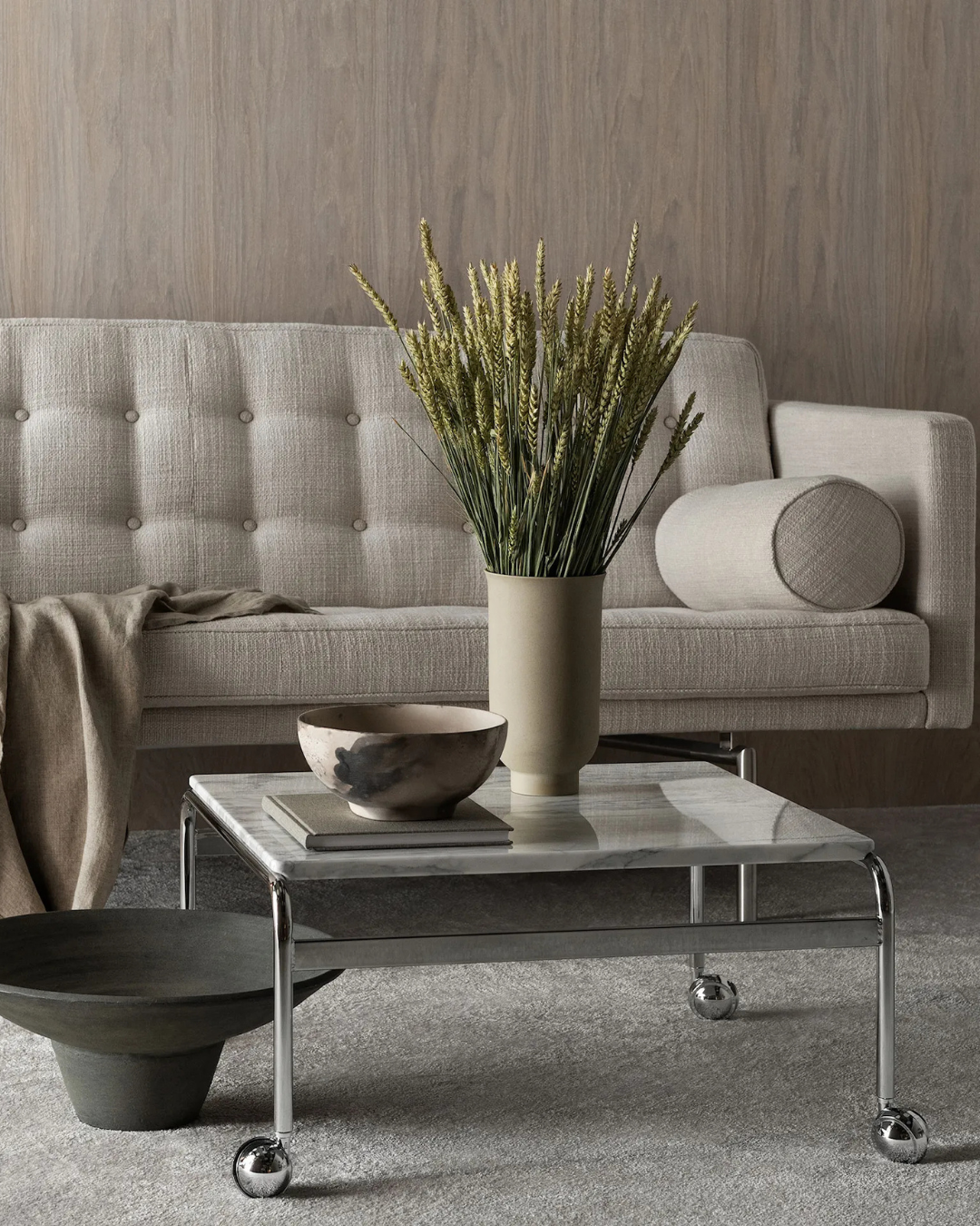 Salongbordet kjennetegnes av sin eksklusive bordplate i Carrara-marmor, kombinert med et stilrent understell i forkrommet stål. De integrerte hjulene gjør bordet enkelt å flytte, noe som gir fleksibel bruk både i stue, kontor eller loungeområder. Den rene formen og materialkombinasjonen gjør at bordet glir naturlig inn i ulike interiører og tilfører rommet et sofistikert preg.