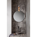 Rope er et rundt speil med en kraftig lærstropp bundet fast i den ene enden. Stroppen er utført i kjernelær og gir det enkle og minimalistiske speilet et eget særpreg.