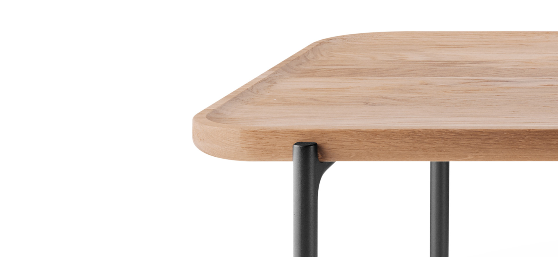 Bordet består av en bordplate i massiv eik og tilhørende understell i svart, pulverlakkert resirkulert aluminium.