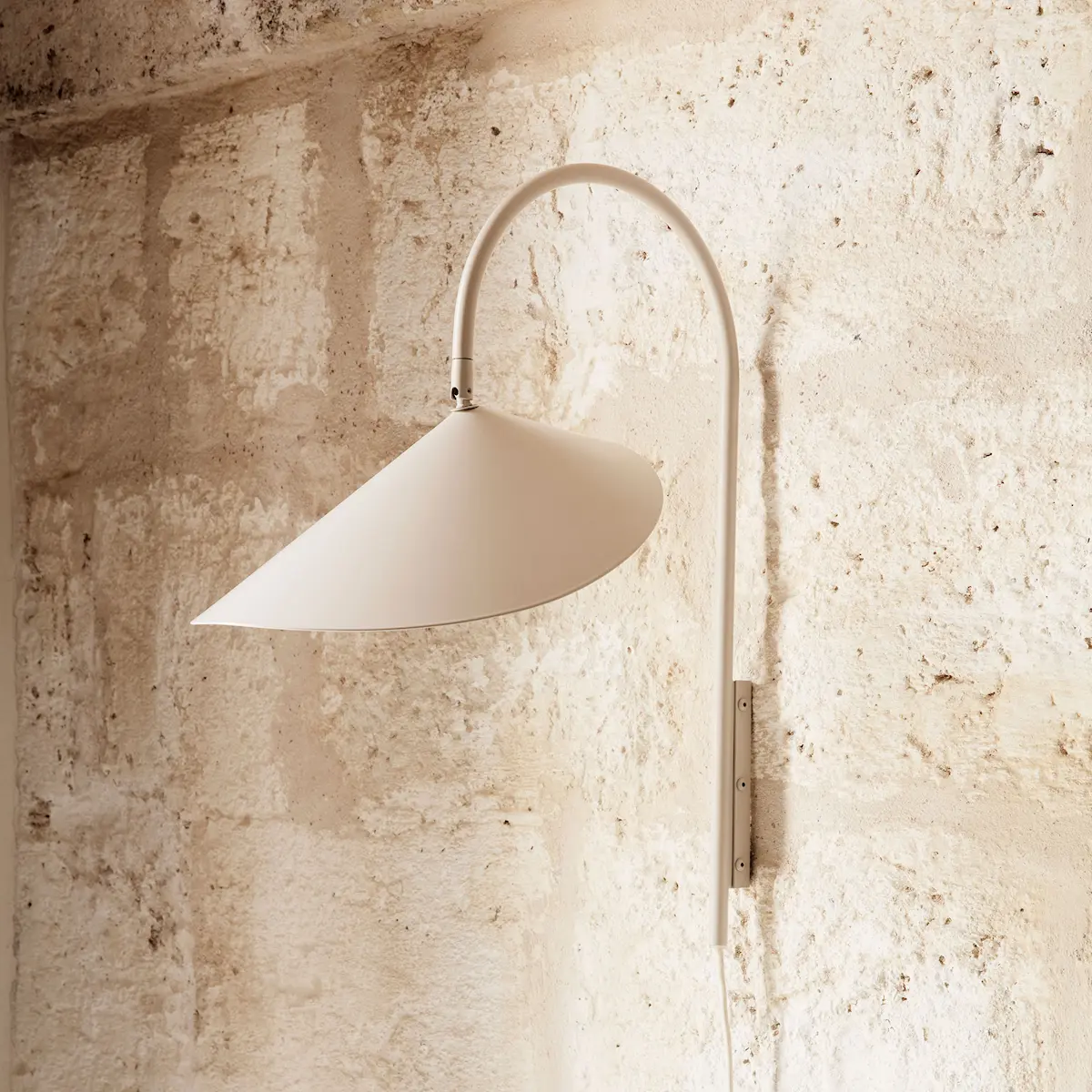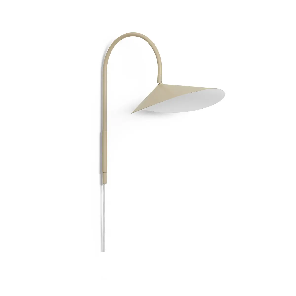 Arum Swivel fra Ferm Living er en vegglampe med en skjerm i organisk form som elegant henger fra en buet metallbue på en bladlignende måte. Med den matte, off- white innsiden av skjermen gir lampen et mykt og jevnt fordelt lys, noe som gjør den perfekt som nattbordslampe. Lampearmen har et svingbart feste som tillater rotasjon i alle retninger for optimalt lys i forskjellige miljøer . Lampen er utstyrt med en tekstil ledning med bryter og leveres med et veggfeste for enkel installasjon.