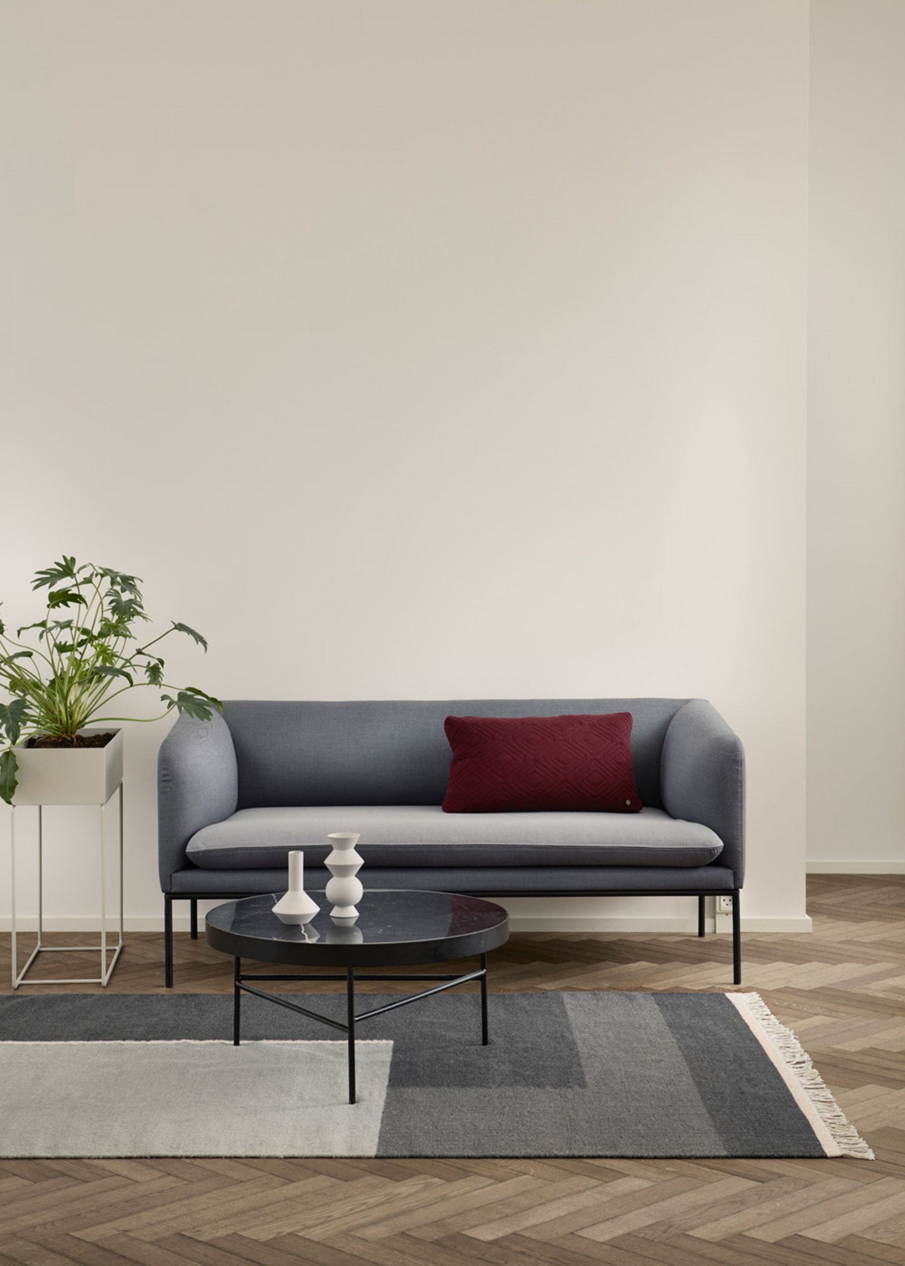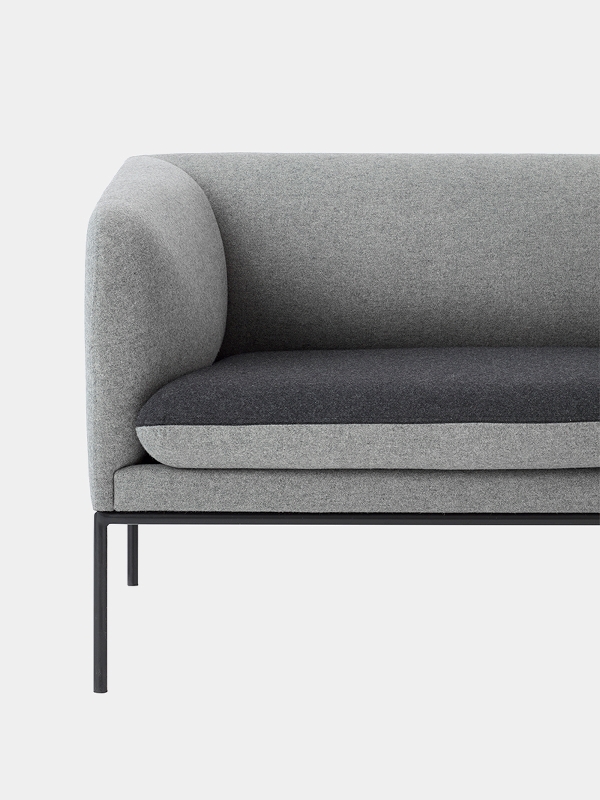 Turn sofa fra Ferm Living. Med et minimalistisk designspråk, strenge, rette linjer og myke runde former skaper denne vakre sofaen en elegant, enkel og luftig følelse. De slanke metallbena er produsert i pulverlakkert stål. Sofaens pute er vendbar, som gjør det enkelt å endre utseende etter følelse, ønske og humør. Legg merke til at trekket på puten, selv om det har glidelås, ikke bør tas av for å vaskes. Vask bør kun utføres av profesjonelle renseri.