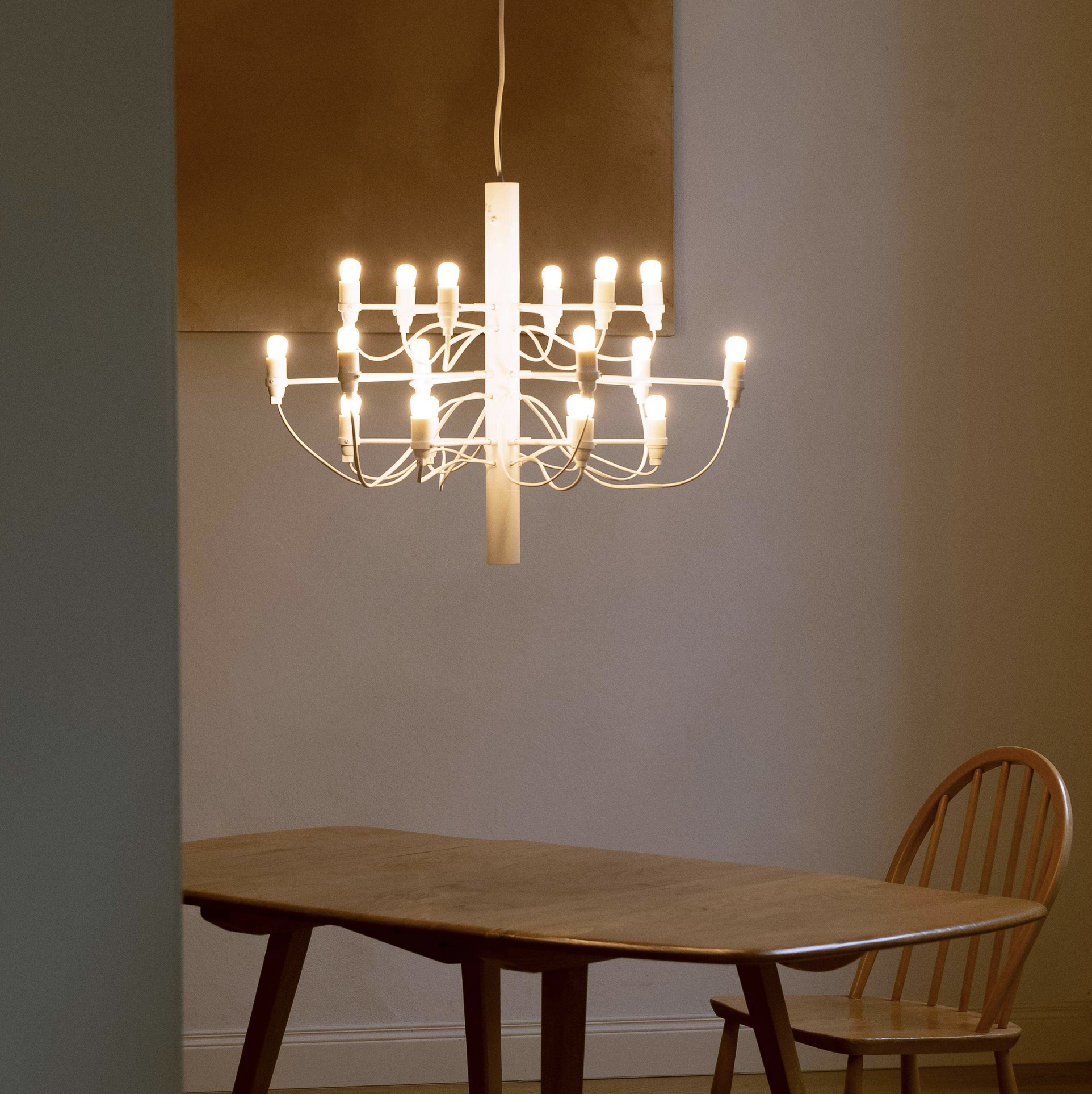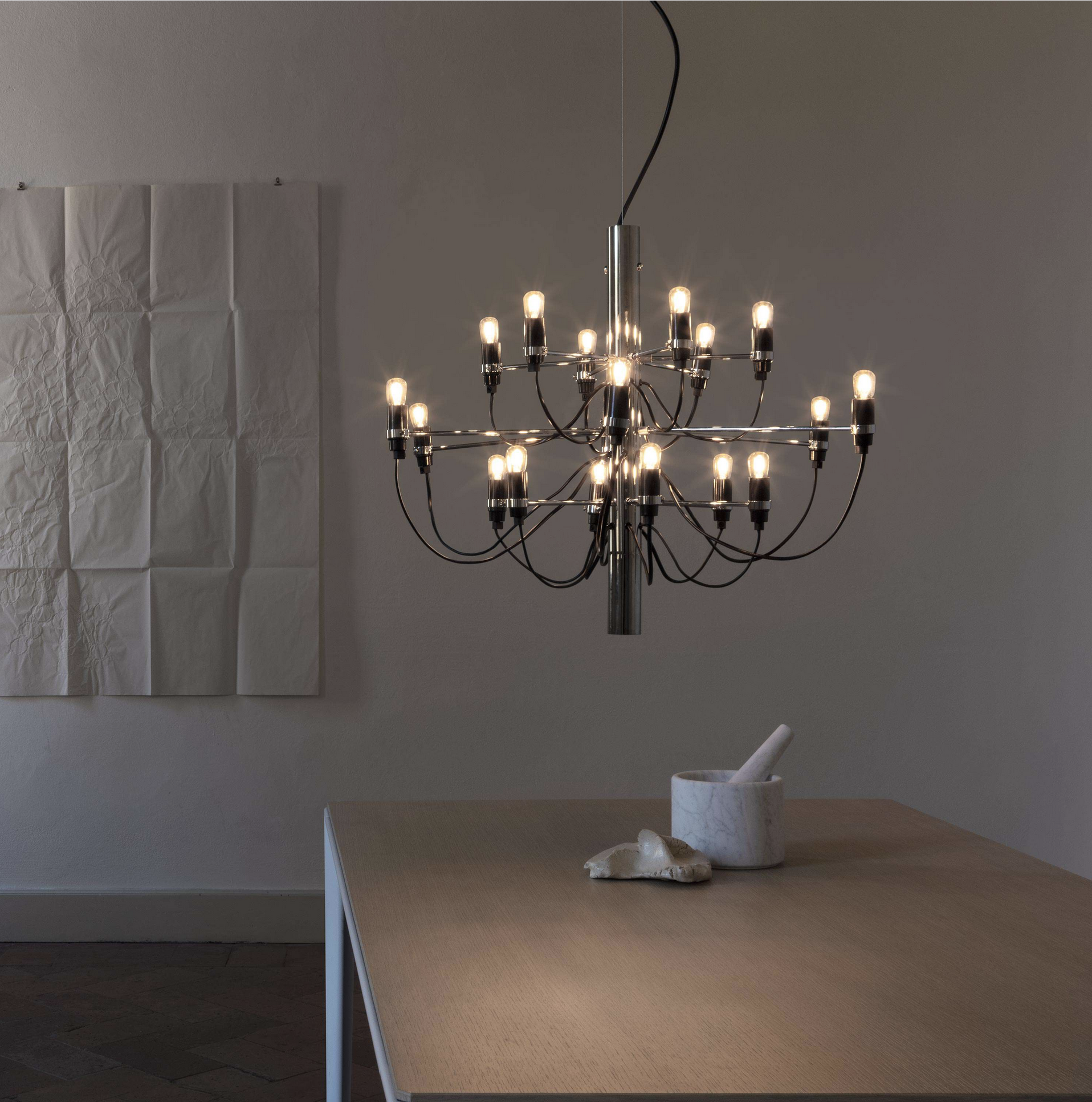 Med sine 18 lyspunkter gjør Flos 2097/18 et kraftfullt visuelt inntrykk og egner seg spesielt godt i rom med god takhøyde, som over spisebord, i trapperom, stuer eller representative offentlige miljøer. Lampen leveres med takfeste og rosett i stål for et helhetlig og gjennomført uttrykk.