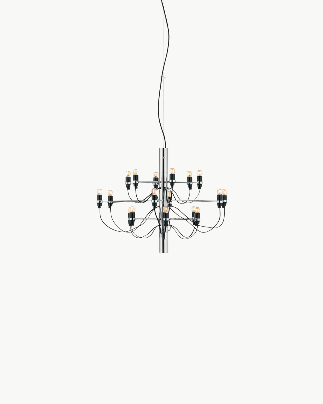 Flos 2097/18 er en ikonisk lysekrone og et mesterverk innen italiensk belysningsdesign. Opprinnelig designet av Gino Sarfatti i 1958, kombinerer lampen det klassiske uttrykket fra en tradisjonell lysekrone med et moderne, industrielt formspråk.