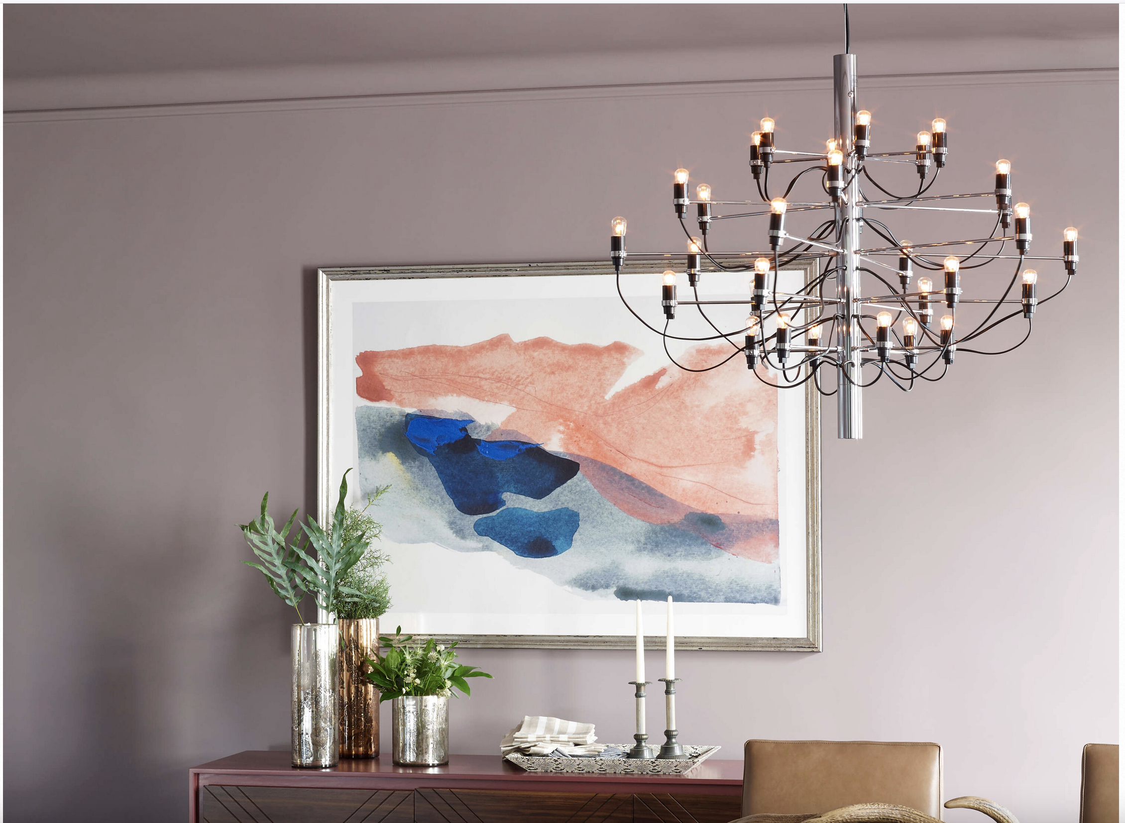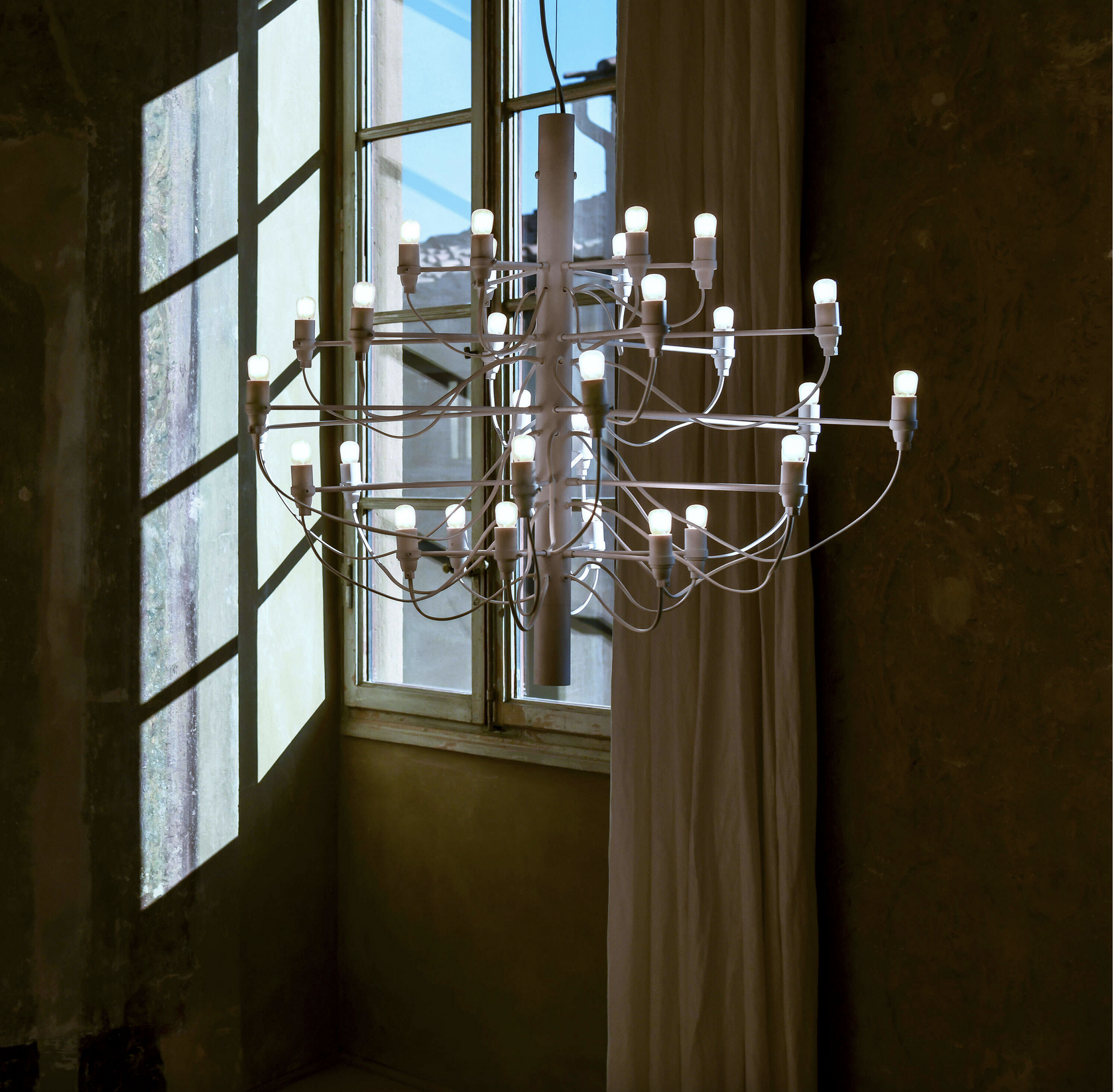 Med sine 30 lyspunkter gjør Flos 2097/30 et kraftfullt visuelt inntrykk og egner seg spesielt godt i rom med god takhøyde, som over spisebord, i trapperom, stuer eller representative offentlige miljøer. Lampen leveres med takfeste og rosett i stål for et helhetlig og gjennomført uttrykk.