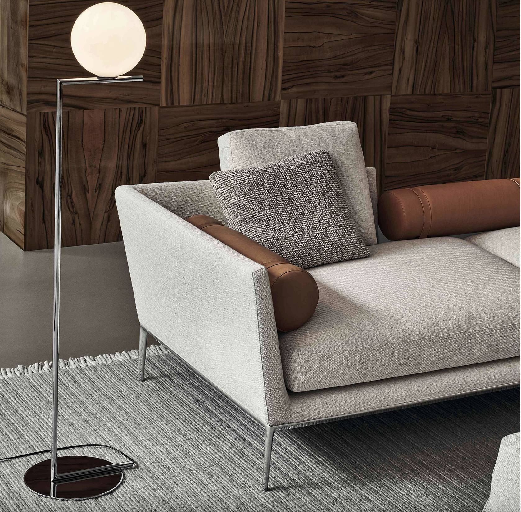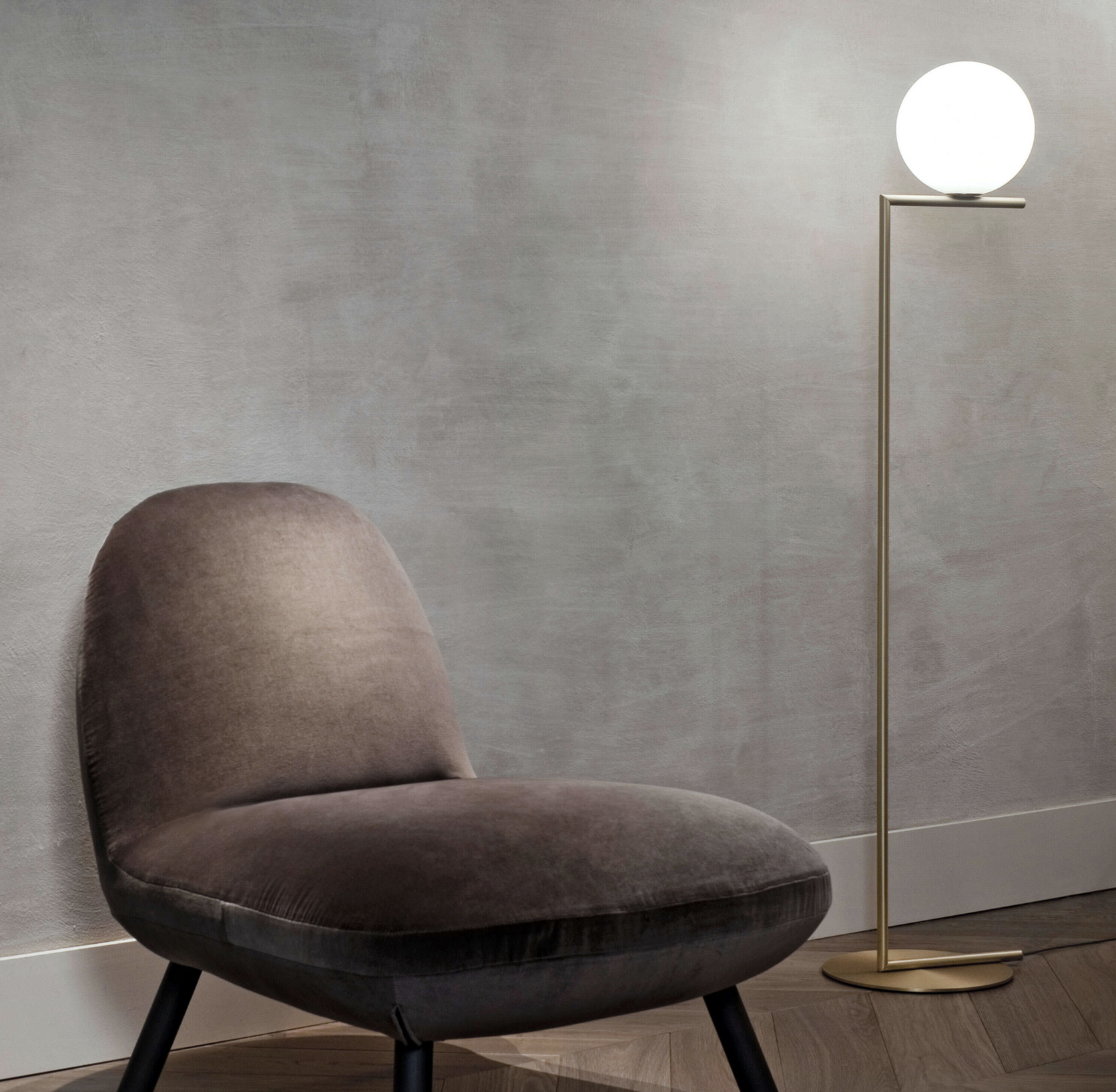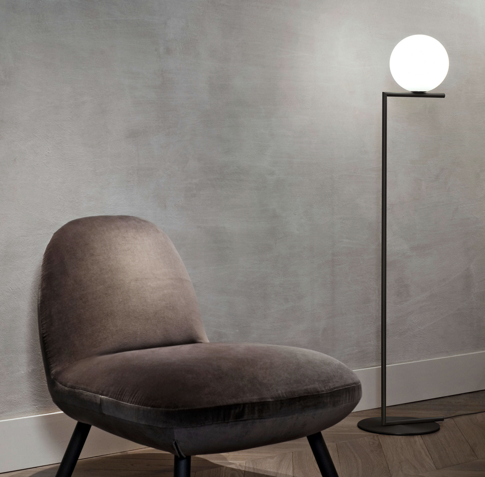 IC Lights F1 er en elegant og ikonisk gulvlampe som gir et mykt, diffust lys. Lampen er designet av Michael Anastassiades i 2014 og har siden blitt en moderne designklassiker. Uttrykket balanserer det tekniske og det poetiske, der den opale glasskulen hviler presist på den slanke metallstammen – inspirert av bevegelsen til en jonglør i perfekt balanse.