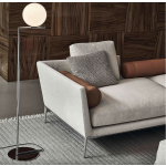Gulvlampen har en ramme i børstet og transparentlakkert messing eller kromstål, kombinert med en munnblåst opalglassdiffusor som gir et behagelig og stemningsfullt lys. Den integrerte dimmeren på ledningen gjør det enkelt å justere lysstyrken etter behov, enten du ønsker dempet atmosfære eller mer funksjonelt lys.
