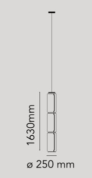 Hengelamper bestående av sammenkoblede glassmoduler som når en lengde på 3,2 mt. (126,77 «) med 4 mt (157,48») hengende strømkabel. Sylindrisk og halvkuleformet, gjennomsiktig blåst glassstruktur, suspendert ringstøpsel av støpt aluminium, hydroformet stål innvendig sidearm og sprøytestøpt optisk opal silikon ytre ringdiffusorer Strømforsyningsenheten i takrosen kan brukes som dimmer for å justere lysintensiteten med 10% til 100% i begge retninger ved hjelp av 0-10 / 1-10V, PUSH, DALI-kontrollen.