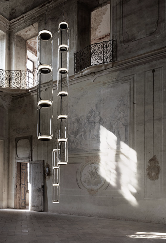 Hengelamper bestående av sammenkoblede glassmoduler som når en lengde på 3,2 mt. (126,77 «) med 4 mt (157,48») hengende strømkabel. Sylindrisk og halvkuleformet, gjennomsiktig blåst glassstruktur, suspendert ringstøpsel av støpt aluminium, hydroformet stål innvendig sidearm og sprøytestøpt optisk opal silikon ytre ringdiffusorer Strømforsyningsenheten i takrosen kan brukes som dimmer for å justere lysintensiteten med 10% til 100% i begge retninger ved hjelp av 0-10 / 1-10V, PUSH, DALI-kontrollen.