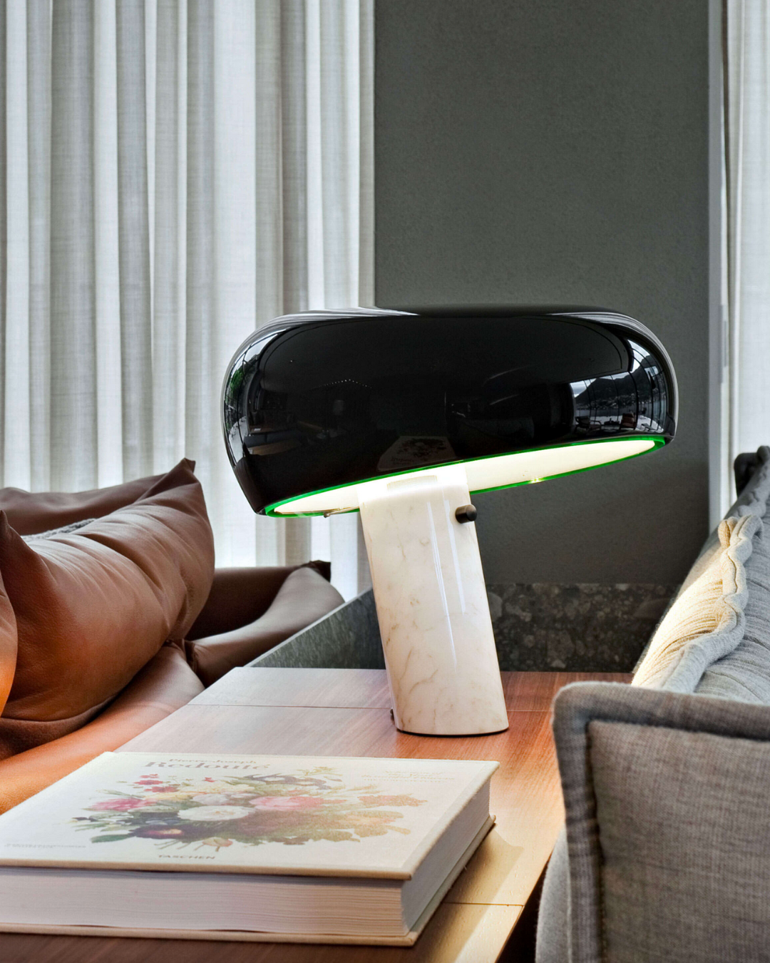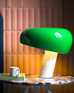 Lampen har en emaljert metallreflektor som gir klart og presist direkte lys, perfekt for skrivebord, sidebord eller nattbord. Basen i hvit Carrara-marmor tilfører et elegant og eksklusivt preg, og gjør lampen til et skulpturelt element i rommet. Snoopy kombinerer håndverk, kvalitet og minimalistisk eleganse på en måte som fortsatt inspirerer designentusiaster i dag.