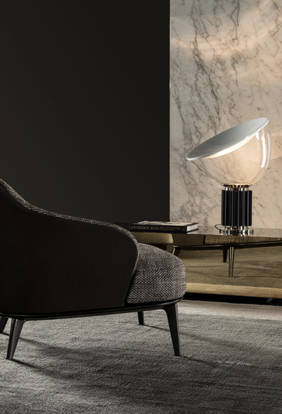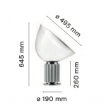 Bordlampe som gir indirekte og reflektert lys. Reflektor i malt aluminium, blankhvit på utsiden og matt hvit på innsiden. Retningsbar diffusor i gjennomsiktig munnblåst glass. Kropp i matt sort, sølvanodisert eller bronseanodisert aluminium. Base i forniklet metall. Elektrisk kabel med nyttig lengde 220 cm, med dimmerbryter for PÅ / AV og justering av lysstrømmen mellom 10-100%. Plug-in strømforsyning med utskiftbare plugger.