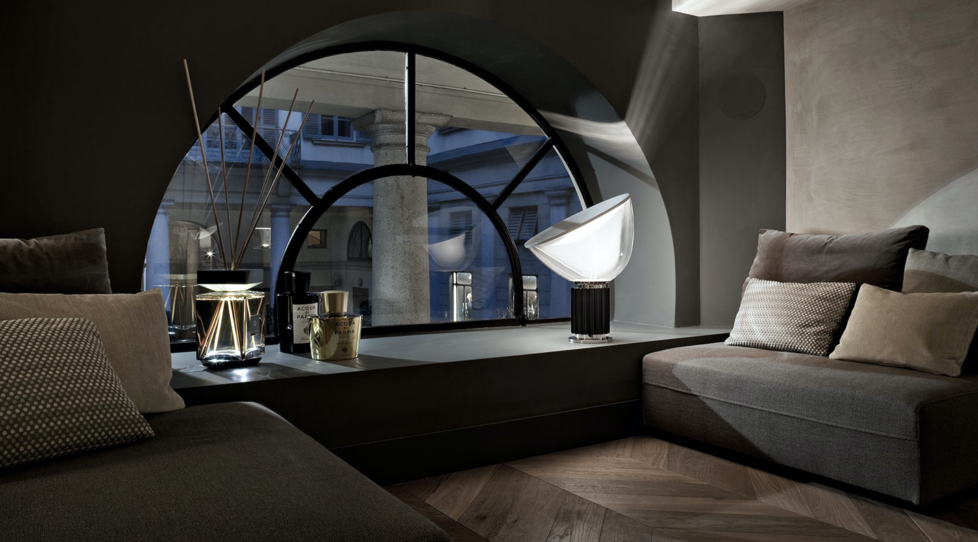 Bordlampe som gir indirekte og reflektert lys. Reflektor i malt aluminium, blankhvit på utsiden og matt hvit på innsiden. Retningsbar diffusor i gjennomsiktig munnblåst glass. Kropp i matt sort, sølvanodisert eller bronseanodisert aluminium. Base i forniklet metall. Elektrisk kabel med nyttig lengde 220 cm, med dimmerbryter for PÅ / AV og justering av lysstrømmen mellom 10-100%. Plug-in strømforsyning med utskiftbare plugger.