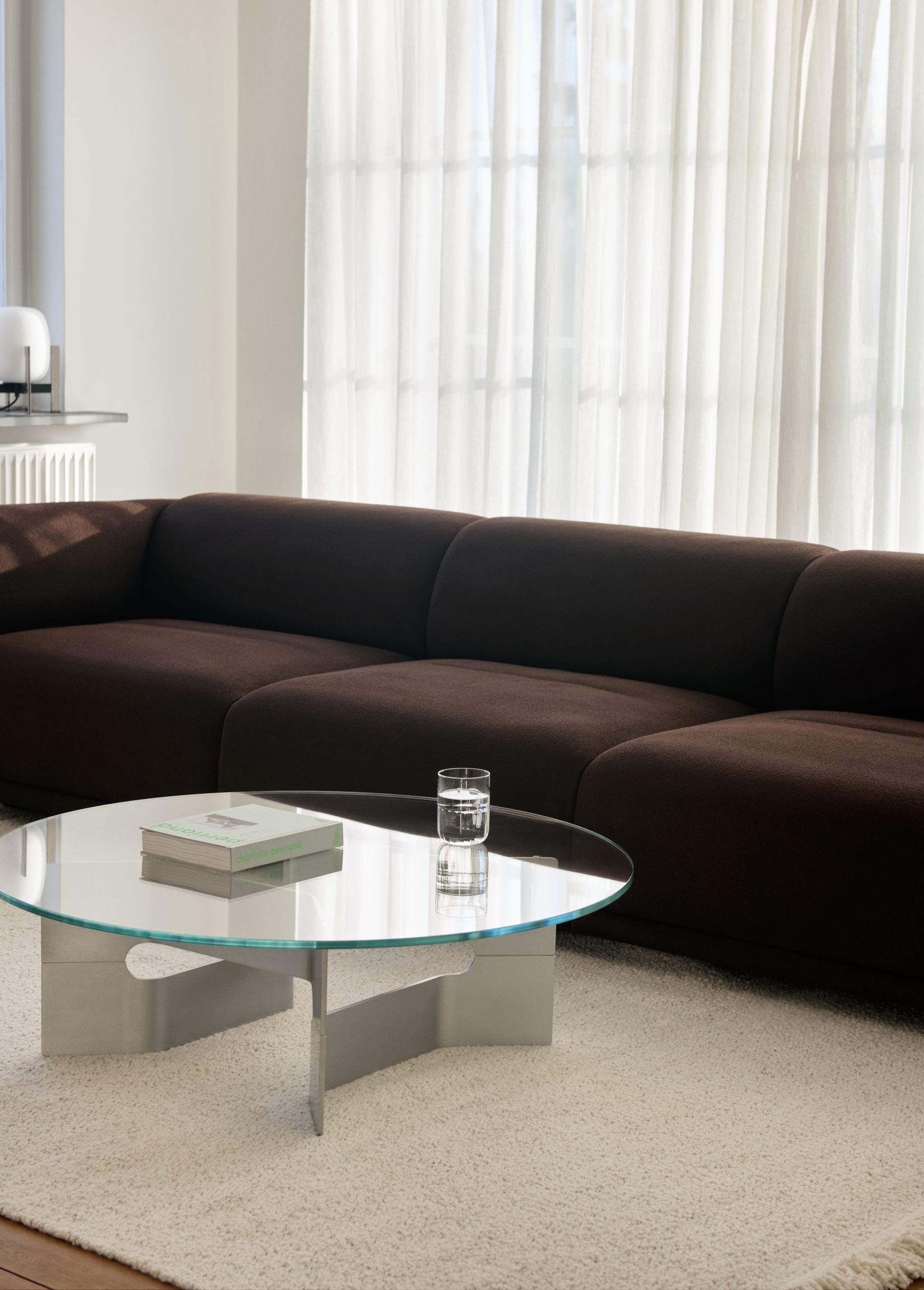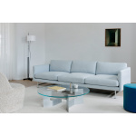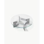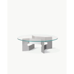 Bordets skulpturelle base er laget i børstet, resirkulert aluminium og kombinert med en bordplate i herdet glass – materialvalg som understreker både funksjonalitet og estetisk finesse. JG Coffee Table er produsert i Danmark med fokus på kvalitet og bærekraft.