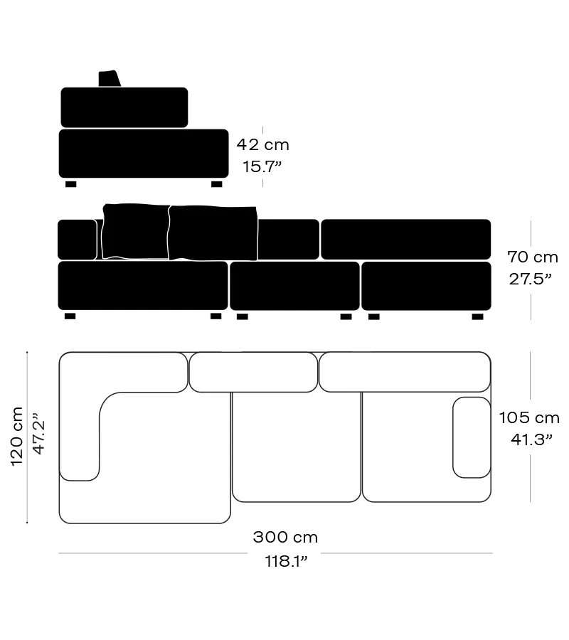 Mål: H 70 L 300 D: 120/105 SH42cm 149,5kg