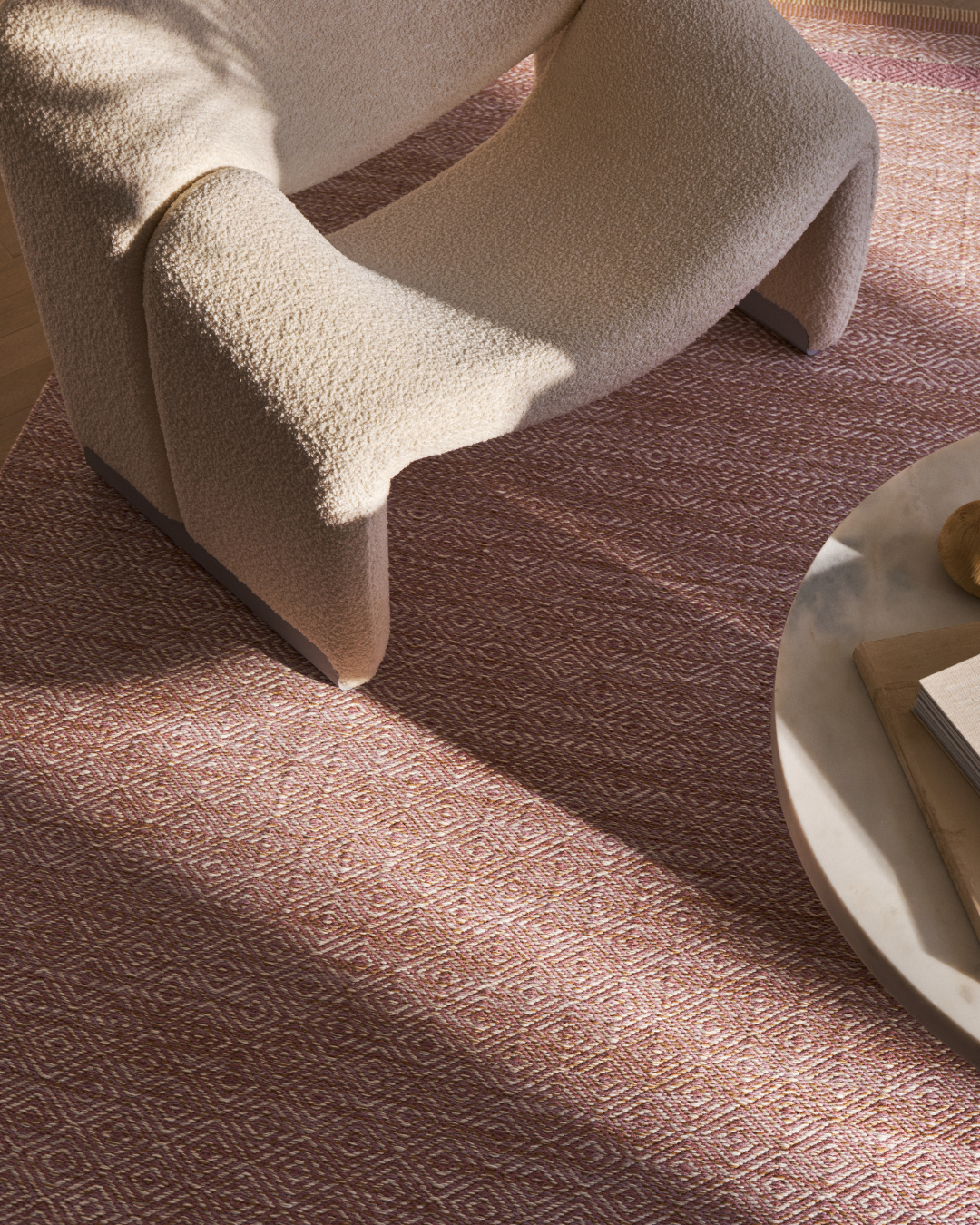 Med sitt ikoniske gåseøye-mønster og dype tekstur, passer teppet like godt i moderne hjem som i klassiske interiører, og fungerer utmerket i alt fra stuer og soverom til kontorer og offentlige rom.