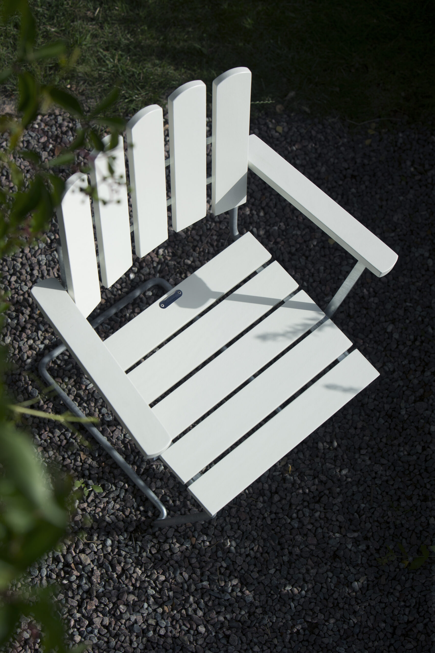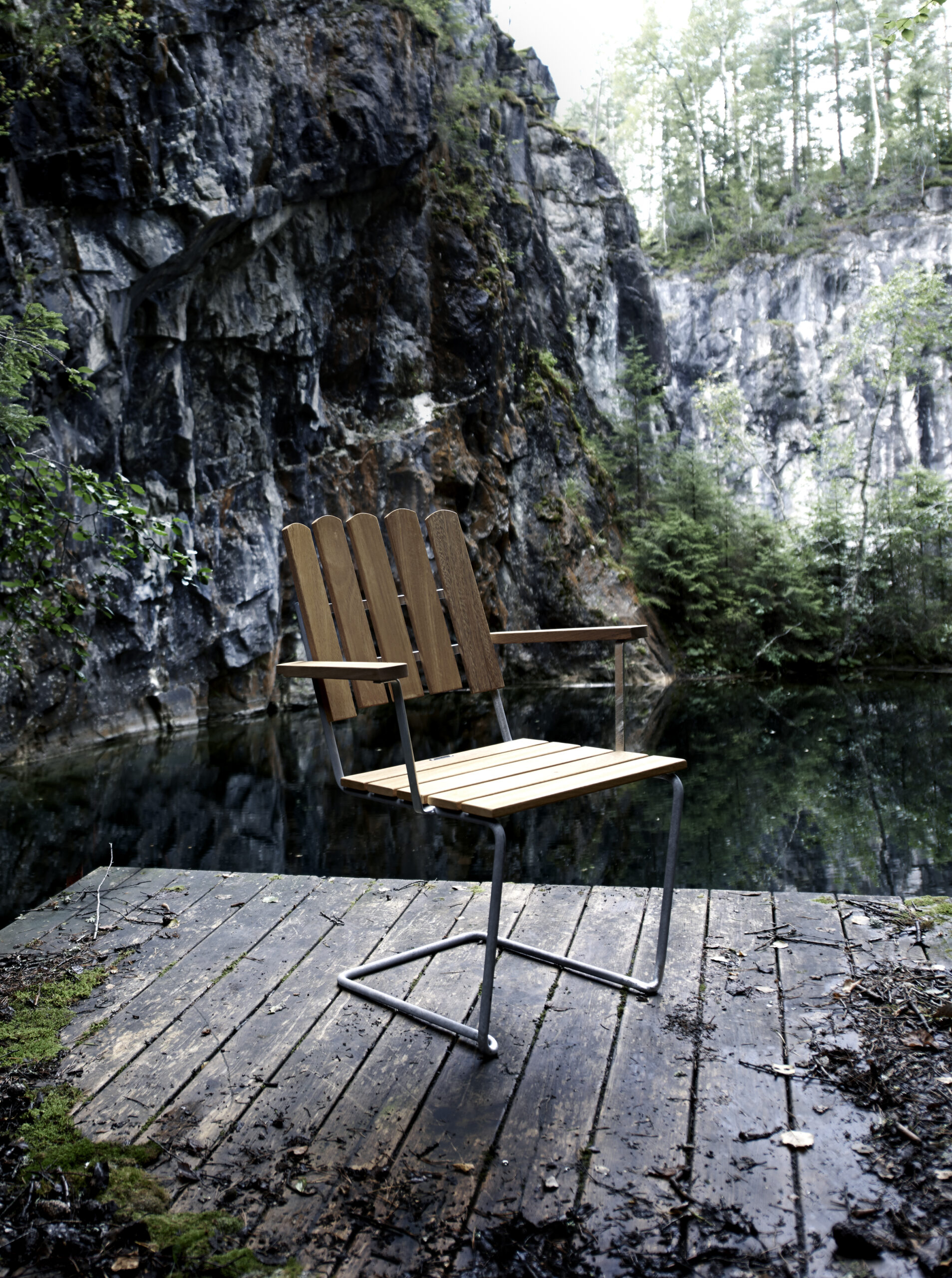 Grythyttan sin klassiske lenestol er kanskje det møbelet som er mest knyttet til Grythyttan Stålmöbler. Den ble designet i 1930 av Artur Lindqvist og har siden den gang vært et kjært innslag i lysthusene våre og i hager rundt om i Sverige. Stativet i solid fjærstål er hemmeligheten bak den betryggende, velkjente feilen.