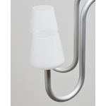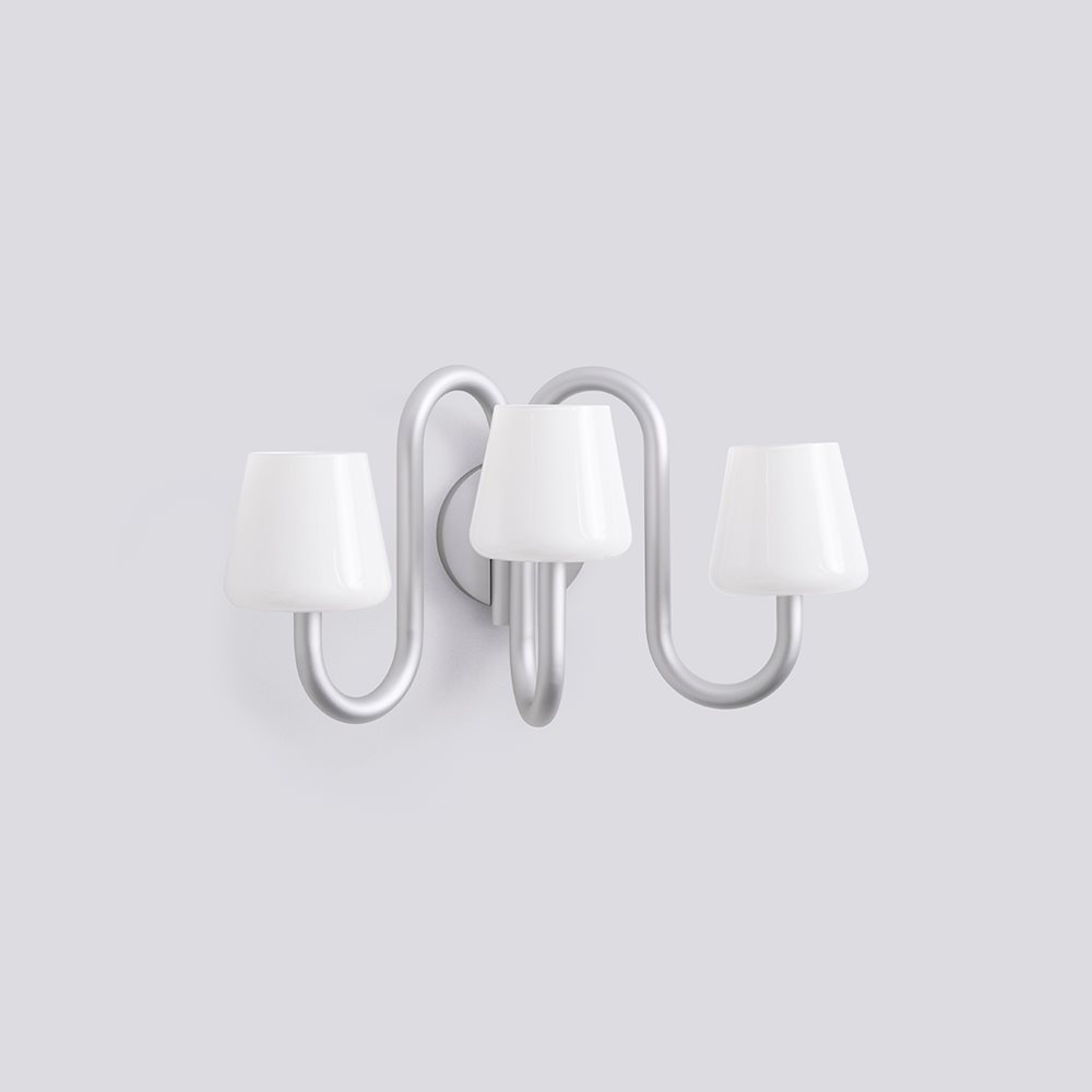 Designet av STUDIO 0405, er Apollo Wall Sconce en moderne versjon av en klassisk lampearketype, som deler grunnleggende strukturelle egenskaper til den tradisjonelle lampetten oppdatert i en skulpturell og funksjonell design. Består av tre munnblåste opalglassskjermer på toppen av buede rørformede armer, og skaper et kontrasterende uttrykk mellom de håndlagde, organisk formede fargene og de industrielle anodiserte aluminiumsrørene. Når den er montert på veggen, kan Apollo Wall Sconce brukes til å fremheve et spesifikt område eller tilføre atmosfære til en rekke private og offentlige steder.